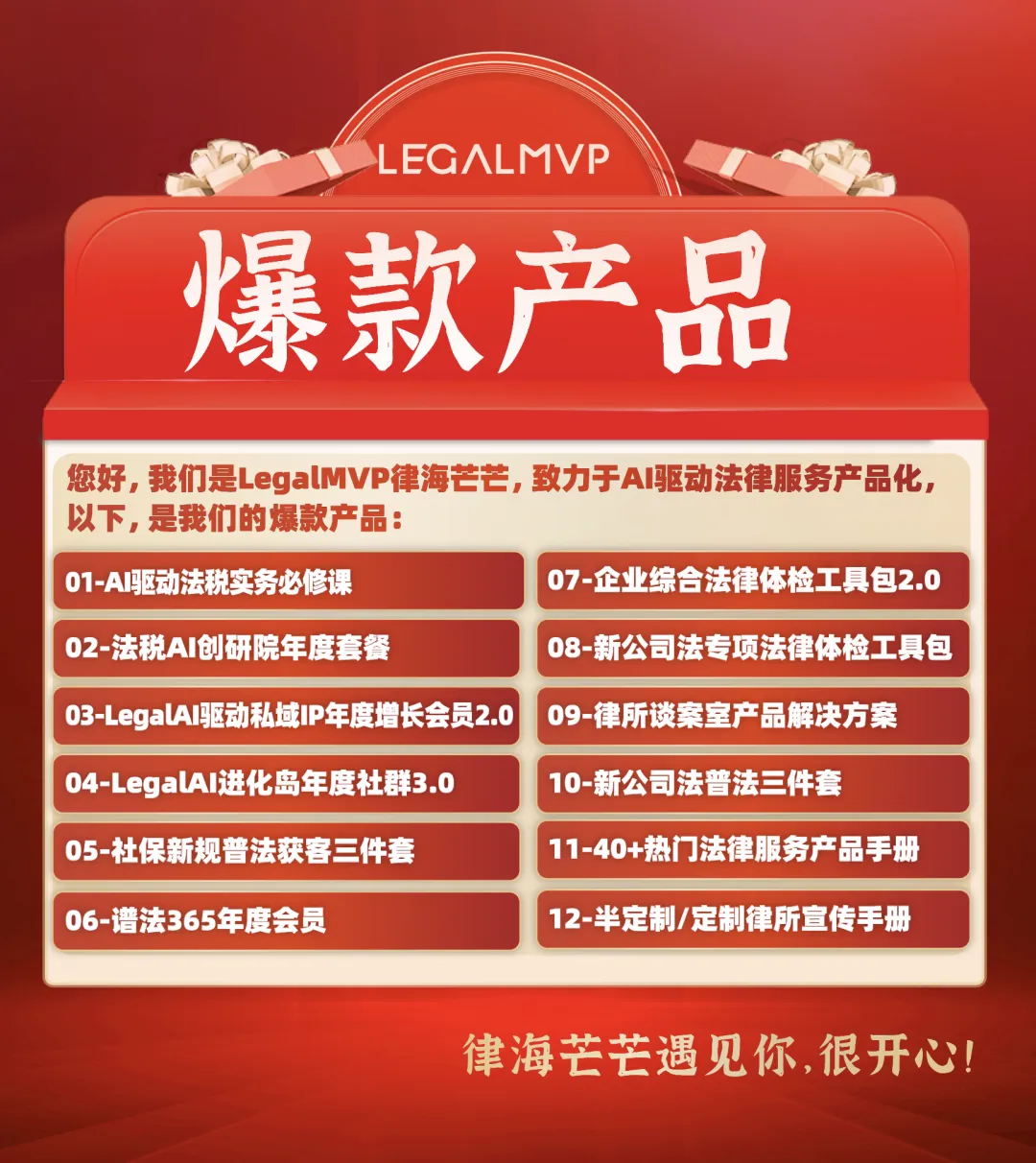 “LegalMVP律海芒芒”公众号为北京律海芒芒科技有限公司官方账号,律海芒芒以法律AI平权为使命,由姚俊倩(郡主CoCo)、王德浩(Wonder)、齐天宇三位创始人领衔。核心产品包括法税实务培训、AI赋能培训、AI技术产品、私域IP打造、法律服务产品落地咨询与工具赋能。了解律海芒芒全部产品,请点击链接:LegalMVP爆款产品,AI驱动法律服务产品化!