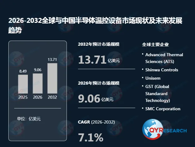 根据QYR(恒州博智)的统计及预测,2025年全球半导体温控设备市场销售额达到了8.49亿美元,预计2032年将达到13.71亿美元,年复合增长率(CAGR)为7.1%(2026-2032)。