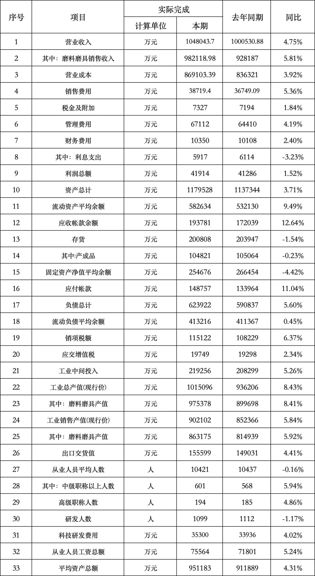 表中可见,2025年重点企业总营收104.8亿元,同比上升4.75%,其中主营产品销售收入98.21亿元,同比上升5.81%;实现利润4.19亿元,同比上升1.52%;磨料磨具总产值和销售产值分别完成97.54亿元和86.32亿元,同比上升8.41%和5.92%;在成本/支出方面:营业成本同比上升3.92%,负债同比上升5.6%,应收账款余额同比上升12.64%,应付账款同比上升11.04%,研发投入同比上升4.02%,工资总额同比上升5.2%。