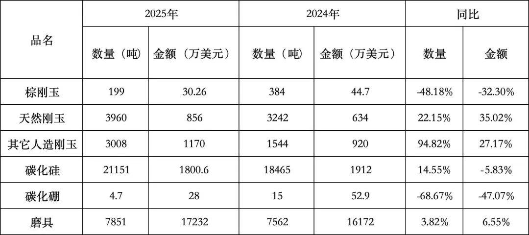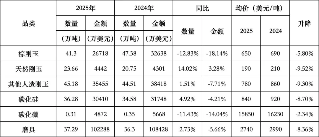 但具体到磨料磨具行业,各类产品出口总量184.02万吨,较2024年仅同比上升0.08%,出口总值20.42亿美元,较2024年同比下降7.7%。