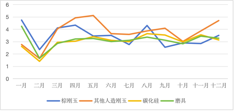 表中可见,棕刚玉出口41.3万吨,同比下降12.83%,其它人造刚玉出口45.18万吨,同比上升1.51%,碳化硅出口36.28万吨,同比上升4.92%,磨具出口37.29万吨,同比上升2.73%。但除天然刚玉外,各类产品的出口额均同比下降,产品均价更是全面下跌,大家可以关注下出口均价,按去年1美元对7.1429人民币的平均汇率计算,各类产品的出口均价与国内销售价格几乎没有差异,甚至个别产品的价格还略低于国内市场价。