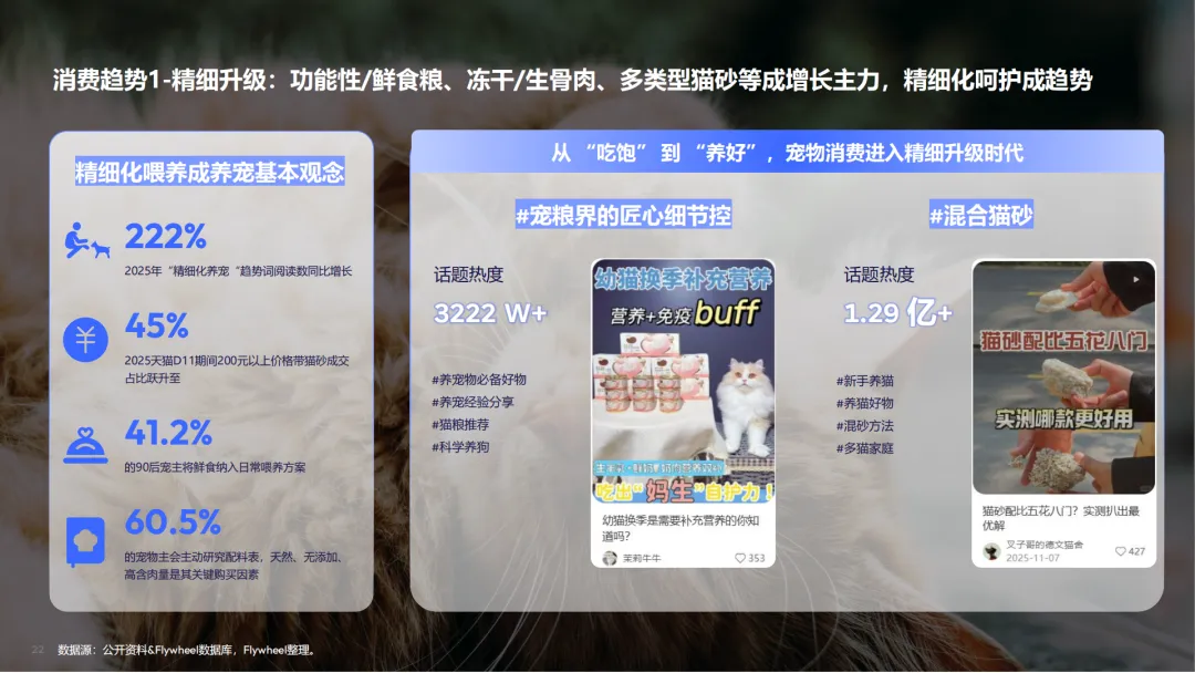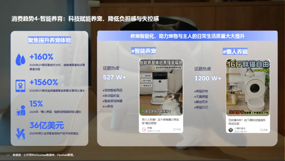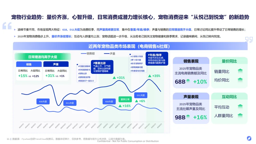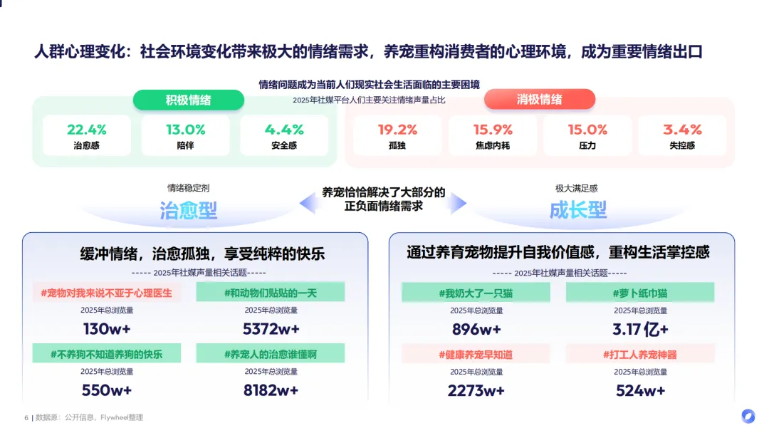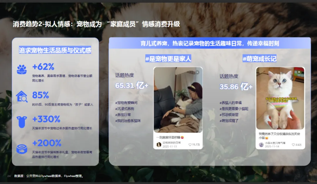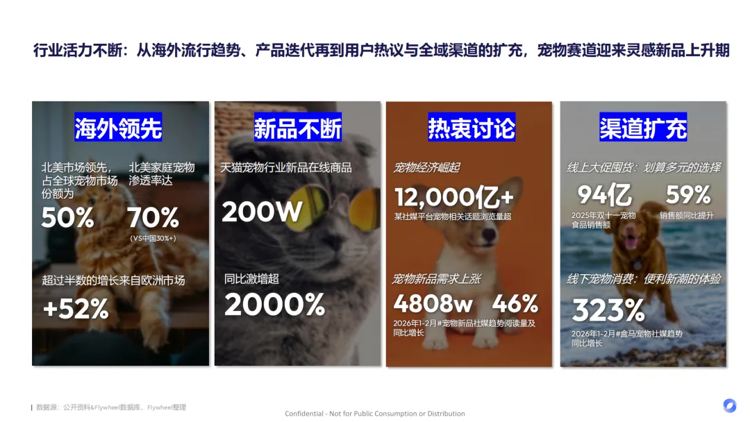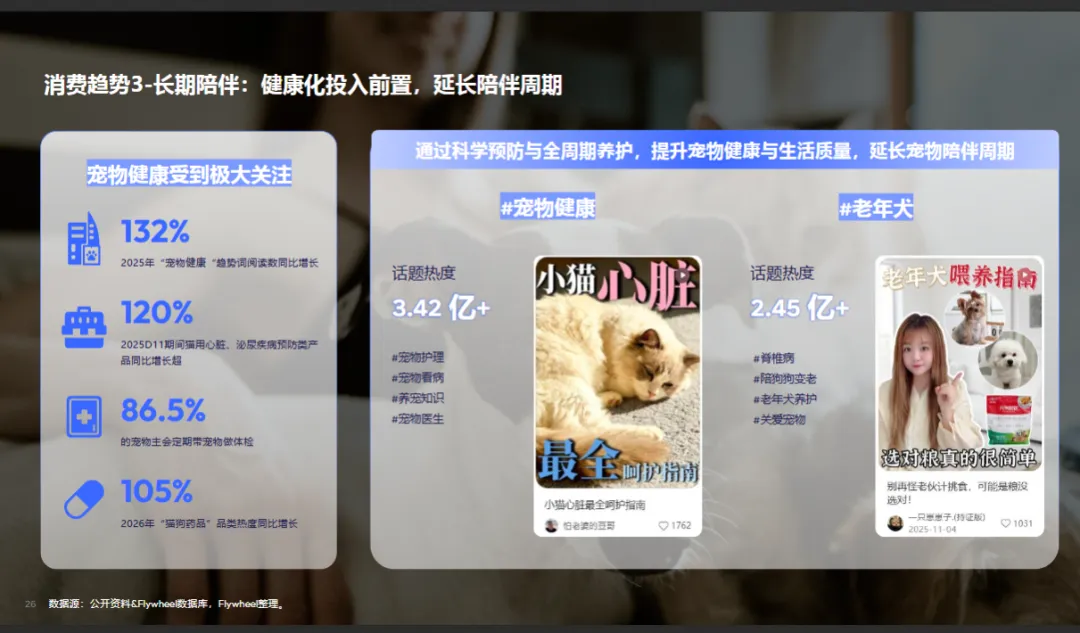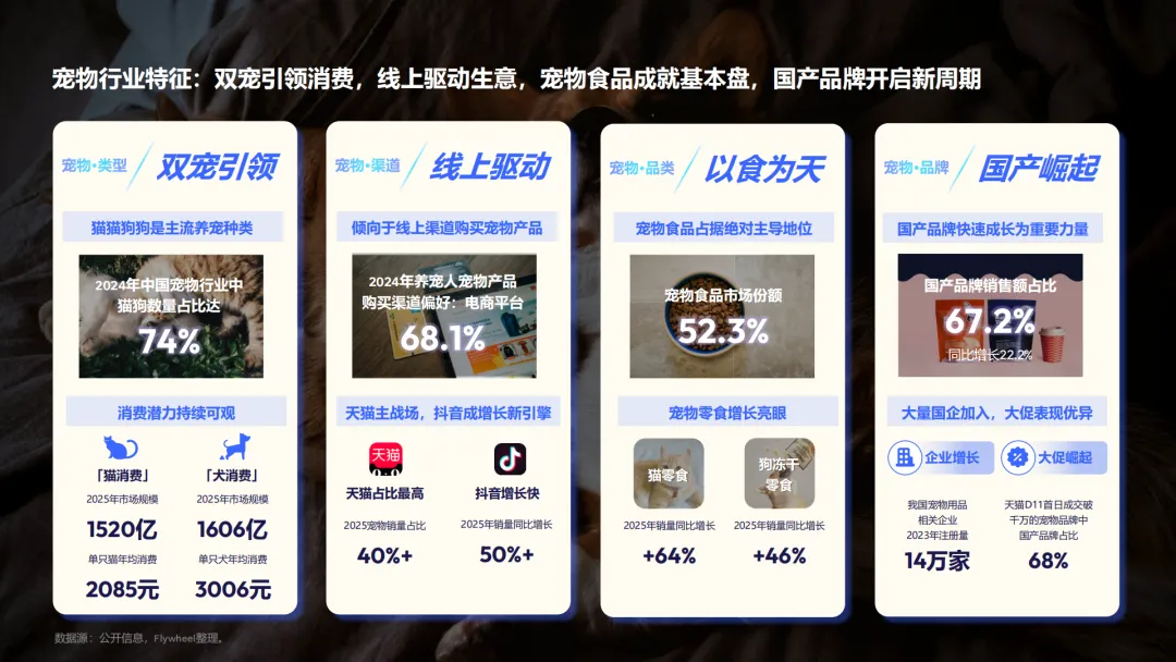 Flywheel 报告以 “育儿式养宠” 为核心,拆解 2026 宠物行业底层逻辑与机会。核心结论:市场规模犬猫消费突破 3100 亿元,城镇宠物超 1.26 亿只,单只年均消费持续走高;人群驱动独居人口扩容、90/00 后成主力(占比 66.8%),82% 消费者愿为情感价值买单,宠物正式 “家庭成员化”[3]。