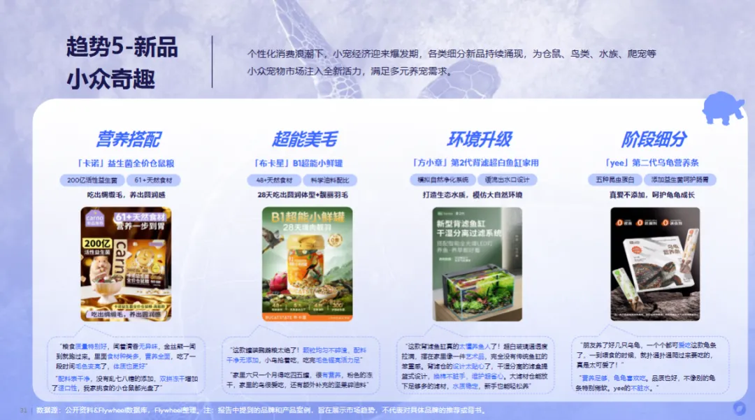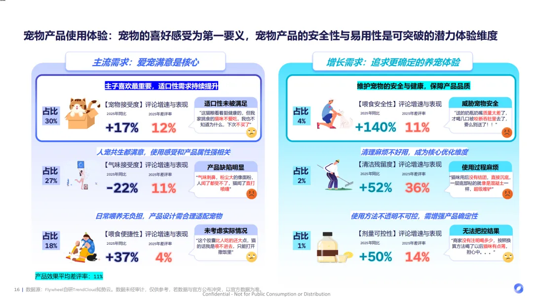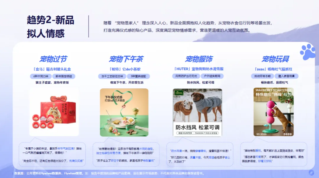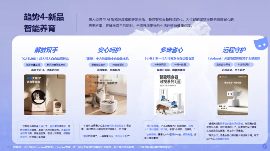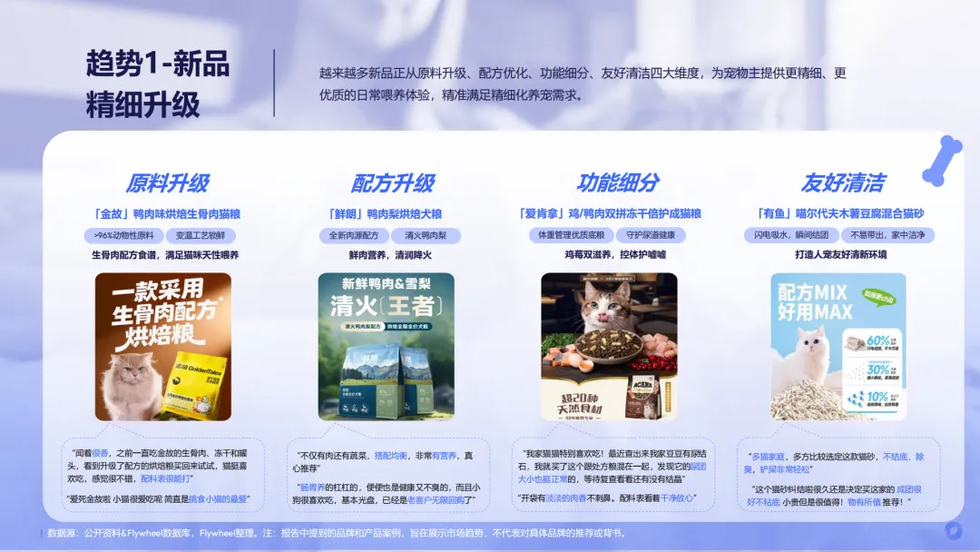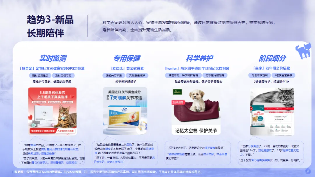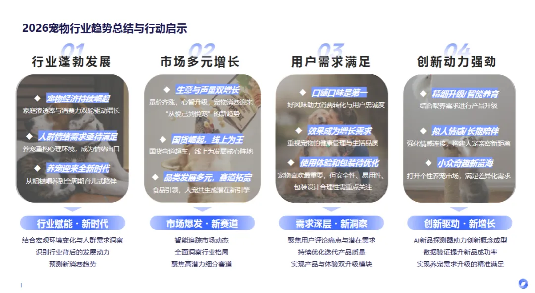 五大趋势重塑赛道:1)消费升级:从 “吃饱” 到 “养好”,鲜粮、烘焙粮等高端主粮占比提升,预防医疗、智能用品(年增速 25%+)成新增长点;2)科技赋能:AI 驱动健康预警、行为分析与个性化推荐,数字化重构运营与服务;3)合规洗牌:政策趋严加速行业出清,合规 + 品牌力企业抢占份额;4)场景延伸:老年护理、宠物殡葬等全生命周期服务爆发,下沉市场提速;5)国产崛起:国产品牌市占率 67.2%,技术与供应链优势凸显。