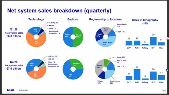 ASML最新Q1财报中,去年Q4存储占30%,今年Q1占51%,超过一半。这一变化与存储芯片(尤其是NAND、DRAM)行业的扩产周期直接相关,长江存储、三星、SK海力士等存储厂商的设备采购显著拉动了需求。存储厂商的扩产周期已明确启动,直接推动了ASML的设备销售结构从“逻辑芯片主导”转向“存储芯片主导”。EUV仍是增长核心,尽管设备交付量环比仅小幅增长,但单台价值极高的EUV设备占比大幅提升,是支撑高毛利的关键。