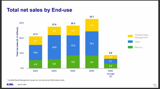 2025年达到327亿欧元的历史新高,其中逻辑芯片(Logic)业务始终是核心收入支柱,2025年贡献161亿欧元;存储芯片(Memory)业务在行业周期推动下显著增长,2024-2025年稳定在85亿欧元左右,成为重要增长极;同时,装机基管理(服务与升级业务)收入也稳步提升,2025年达82亿欧元,展现了设备销售之外的持续盈利韧性。2026年一季度营收88亿欧元,延续了业务的稳健态势,也反映出存储芯片扩产周期对设备需求。