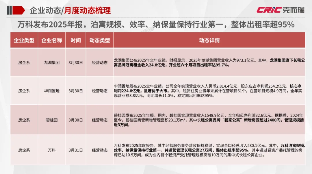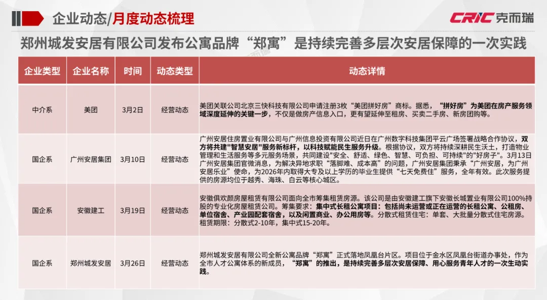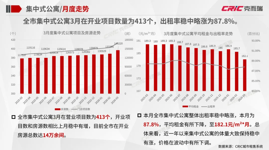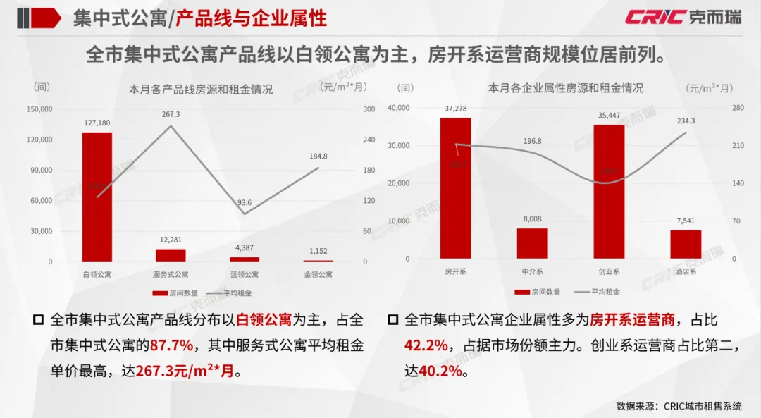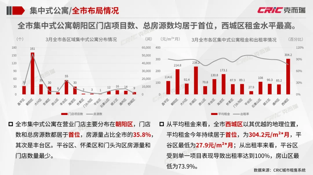 集中式公寓:全市集中式公寓3月在开业项目数量为413个,出租率稳中略涨为87.8%;全市集中式公寓朝阳区门店项目数、总房源数均居于首位,西城区租金水平最高;全市集中式公寓产品线以白领公寓为主,房开系运营商规模位居前列。