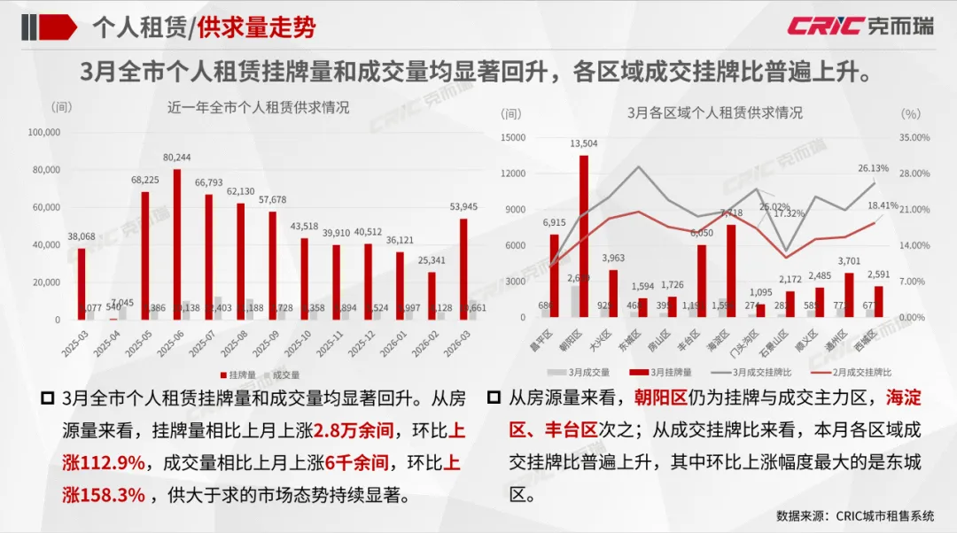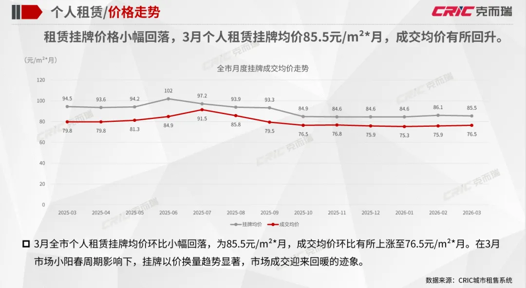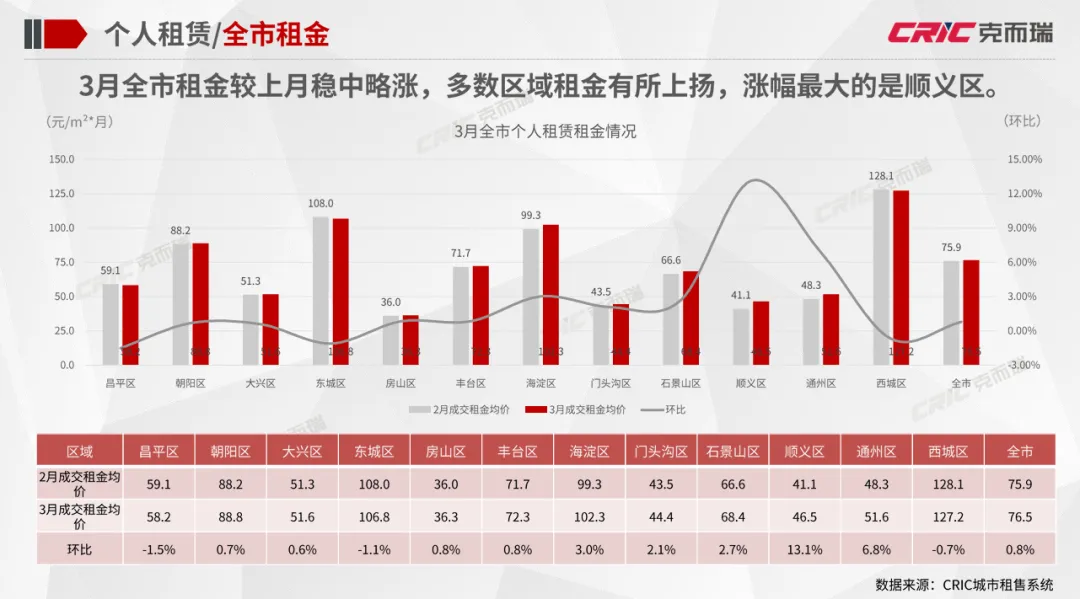 个人租赁:3月全市租金较上月稳中略涨,多数区域租金有所上扬,涨幅最大的是顺义区;3月全市个人租赁挂牌量和成交量均显著回升,各区域成交挂牌比普遍上升;租赁挂牌价格小幅回落,3月个人租赁挂牌均价85.5元/m²*月,成交均价有所回升。