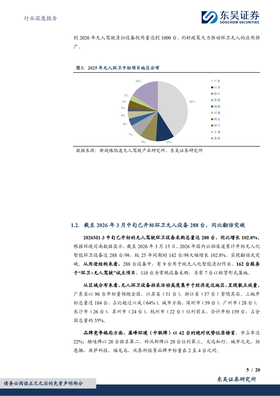 市场规模方面,2025 年环卫无人项目数量占自动驾驶领域 30%,中标金额超 126 亿元,同比大增超 150%,涉及设备约 1300 台,广东以 41% 项目占比居全国首位。2026 年截至 3 月 15 日,已开标环卫无人设备 288 台,同比翻倍增长,其中 56% 用于 “环卫 + 无人驾驶” 试点,广东、江苏、浙江三地开标量占比超六成,深圳、广州为核心落地城市。品牌格局上,盈峰环境市占率 22% 排名第一,酷哇科技、科沃斯紧随其后。