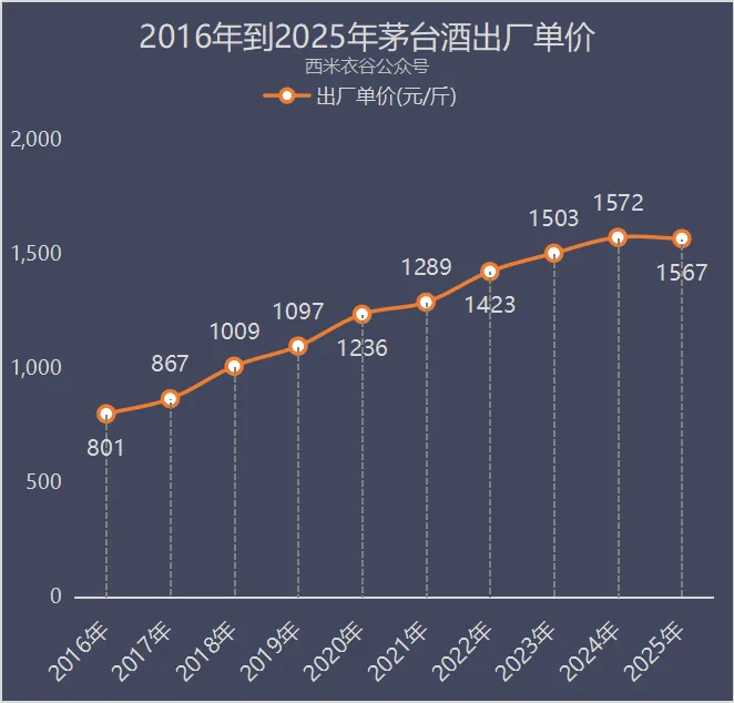 4月16日晚间,贵州茅台发布了一份王者风范依旧,但已显蹒跚老态的年报:2025年公司营收1720.54亿元,同比微跌1.21%;净利润823.2亿元,同比跌4.53%。各路媒体和网友都唏嘘慨叹:这是贵州茅台自2001年登陆上交所以来,首次录得营收和净利润双降。上市25年来,贵州茅台用自己的业绩神话,奠定了自身在A股市场上万王之王的至尊地位,多年来受到无数人敬仰朝拜。那个深藏在万山丛中的偏僻小镇,成了许多腰缠万贯的饮士心目中的耶路撒冷和麦加,每年都要去朝圣一次。2001年上市的时候,规模茅台年营收仅16亿元,到2025年翻了106倍,在长达24年的时间里,年复合增速达到了梦幻般的21.52%。2001年公司净利润仅有3.28亿元,到2025年翻了250倍!年复合增速达到比梦幻还梦幻的25.89%。在这期间,2022年是一个标志性年份。该年茅台酒销售收入首次超过1000亿元,成为饮料行业中放眼全球也罕有敌手的超级大单品。到2025年,茅台酒销售收入达到1465亿元,大概只有饮料界的不朽神话可口可乐能够领先一个身位(可口可乐公司没有单独披露可口可乐系列的销售数据,但根据公开数据预估在2000亿元之上)。西米衣谷不久前曾在文章《从一组官方数据看过去十年中国人的酒量下降得有多猛》中提到,2016年可谓是中国白酒行业的一个分水岭。这一年,规模以上白酒企业产量登顶,达到1358.4万千升,随后开始掉头向下,仅仅十年的时间,产量就下降到354.9万千升,仅剩下零头。也就是说,假设人数和饮酒频率保持不变,十年前饮士们的酒量是半斤,那么到现在已经下降到一两。但很显然是街头巷尾喝老白干二锅头的普通老百姓酒量在断崖式下滑,喝茅台的大佬们依然体力爆棚、精力过人、战斗力十足。证据是这十年茅台酒的销量仍在节节攀升:2016年全行业白酒产量见顶的时候卖掉2.29万吨,到2025年白酒产量只剩零头的时候卖掉4.68万吨,堪称逆风翻倍,强者恒强。这十年中,2016年和2017年销量大增,属于放量做规模阶段。2018年到2022年,控制销量的刹车踩到冒烟,属于控量提价阶段,这个阶段茅台酒遭到哄抢,零售价格节节攀升。2023年到2024年,高端白酒的市场紧俏度开始松动,公司连续两年向市场投放超过10%增量的茅台酒,进入放量保增长阶段。然后就是刚刚过去的2025年,0.7%的销量增速意味着,大款们胡吃海喝的战斗力似乎也已经见顶了。用这十年茅台酒的销售收入除以销量,可以得到每斤茅台酒历年的出厂价(这里需要注意的是,实际上一瓶茅台酒并没有一斤,包装盒上明确注明是500ml,大概是9两):从这组数据来看,茅台酒2025年的出厂价已经略有松动,而终端零售价实际上已经经历了长达数年的大跳水,从最高时期超3000元一瓶跌到目前1600多元一瓶。为了挺价,2026年3月30日晚间,贵州茅台发布公告:自3月31日起,飞天53%vol 500ml贵州茅台酒 (2026)销售合同价由1169元/瓶调整为1269元/瓶,自营体系零售价由1499元/瓶调整为1539元/瓶。从之后贵州茅台的股价走势来看,资本市场对公司提价的态度可谓冷淡。正所谓“时来天地皆同力,运去英雄不自由”,已经被宁德时代、中际旭创、寒武纪等科技新王挤出C位的老王,也感受了一把“门庭冷落鞍马稀”的世态炎凉。熬过目前的寒冬,茅台能否继续拾阶而上,上演一出王者归来的史诗级大戏?谁也说不准,一切只能交给无所不能的时间去回答。