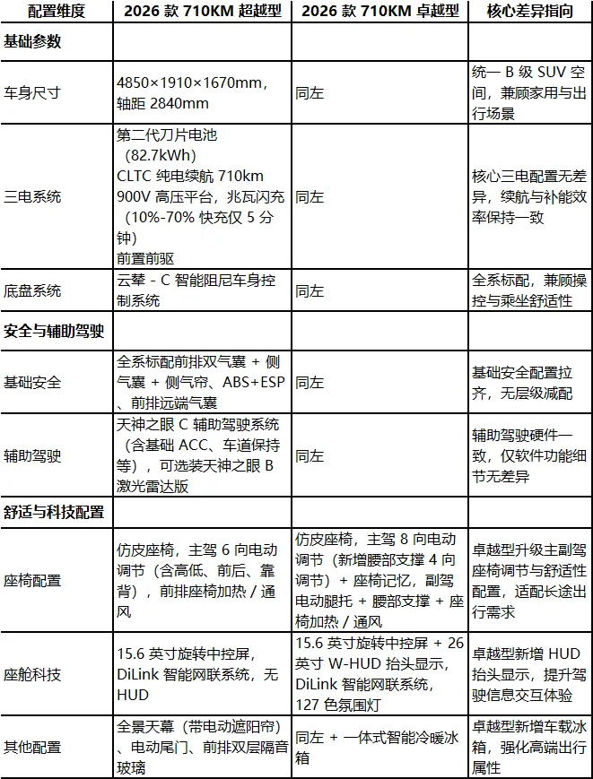 ▲710KM超越型:以更高的性价比和核心配置,成为大多数家庭用户的选择,尤其是对座椅舒适性、HUD 等进阶配置需求不高的用户;