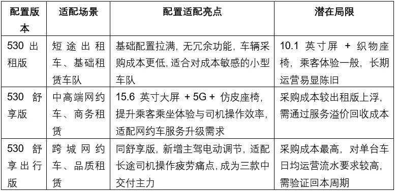 从交付的 3 款配置占比(出租版 31.6%、舒享版 31.6%、舒享出行版 36.8%)来看,配置分层与市场需求高度契合: