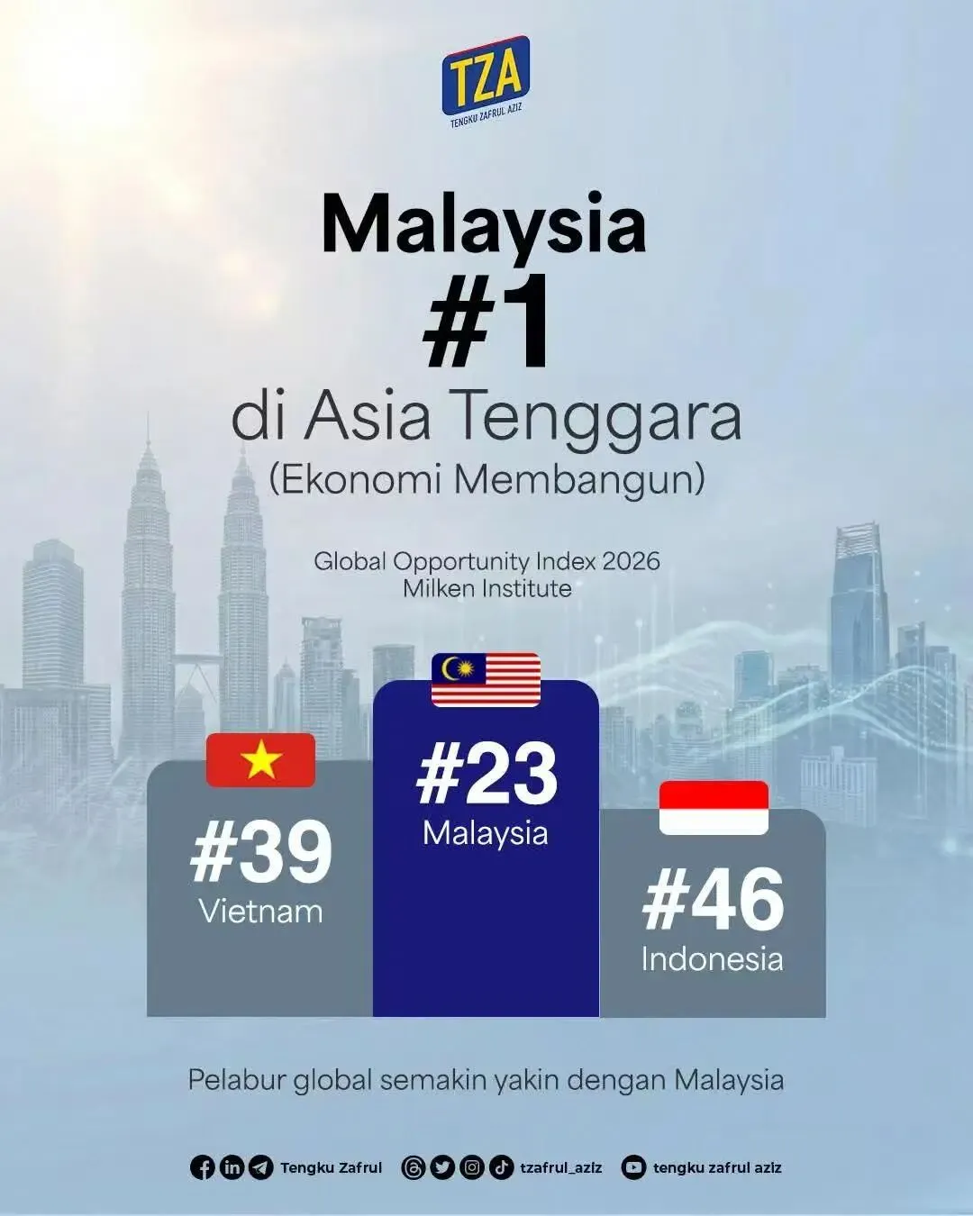 在《2026 全球机遇指数》中,马来西亚全球排名第 23 位,超越印度尼西亚、越南、菲律宾、柬埔寨及老挝等区域同行。
