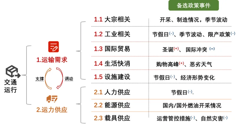 按照聚焦交通经济运行形势强关联指标的原则,构建形成综合交通和宏观经济指标体系以及重大关联政策事件库。