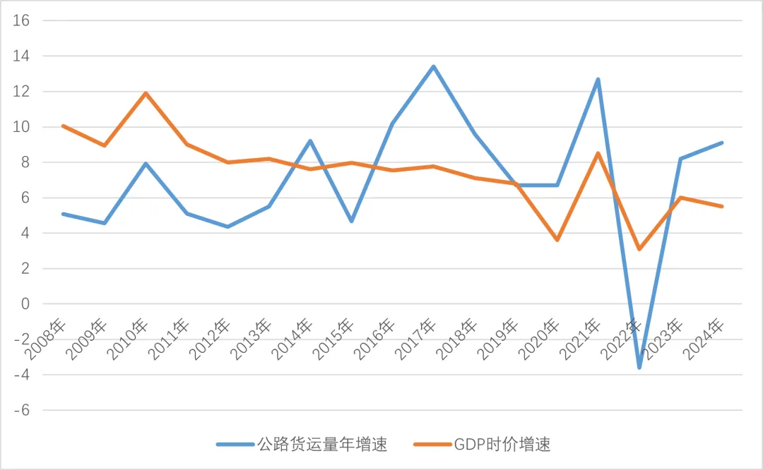 从整体趋势看,自2001年以来,我省公路货运量增速保持在5%至10%之间,基本保持增长趋势。对比公路货运量与名义GDP,发现二者增速变化趋势呈现高度同步。