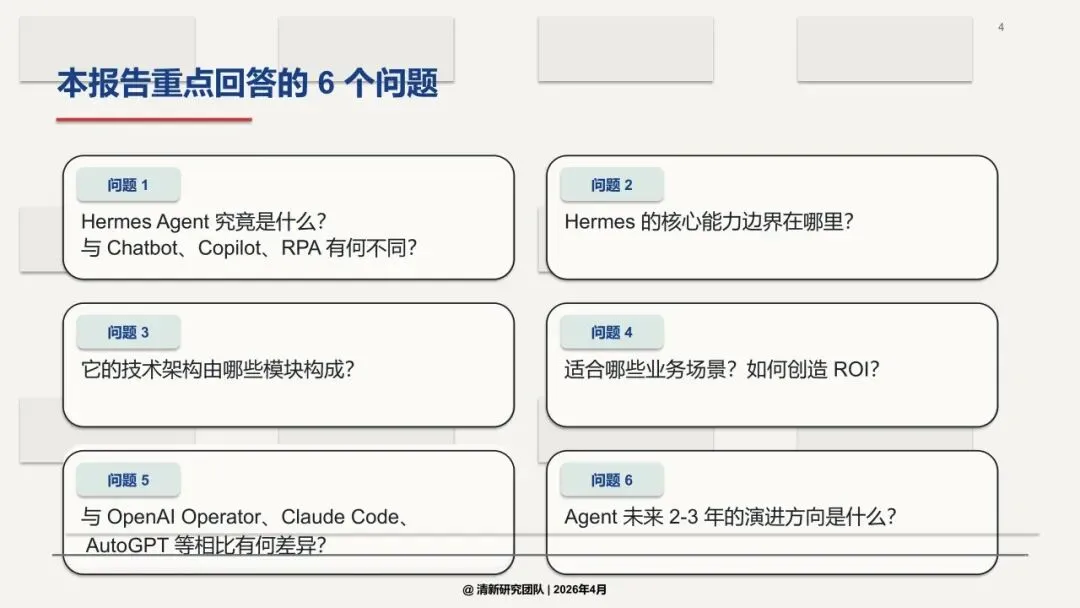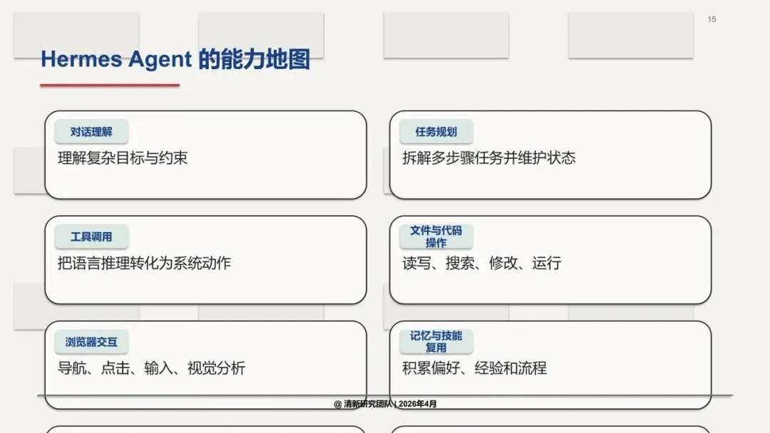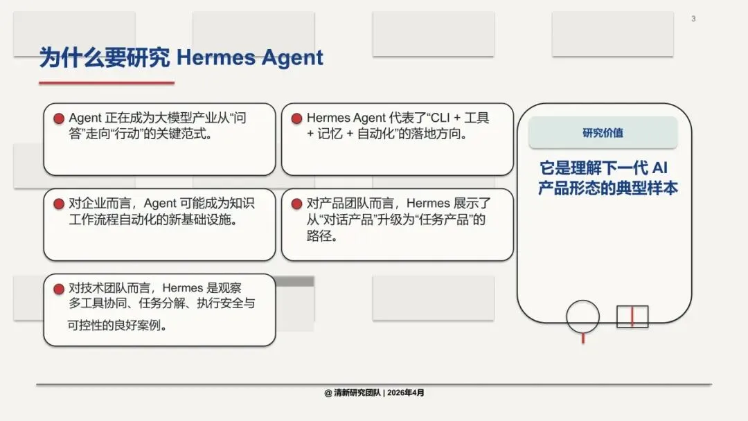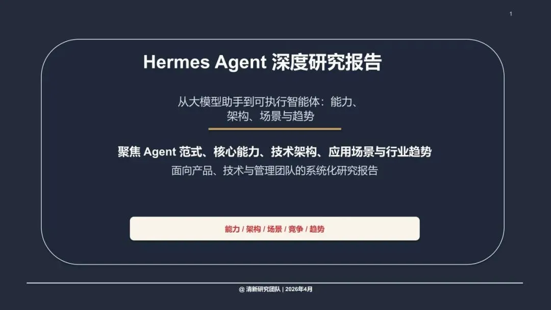 清华大学最新发布的《Hermes Agent深度研究报告》给出了明确答案:能。 Hermes Agent,正是AI从“问答助手”进化为“任务执行者”的代表性产物。