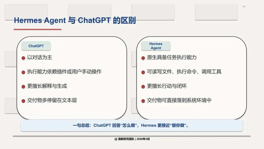 一句话总结:Hermes不是一个更会聊天的模型,而是一个更会做事的系统。