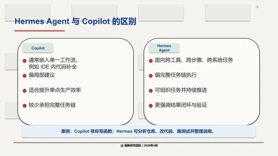 比如,Copilot能帮你写函数,Hermes却能分析整个代码仓库、修改文件、跑测试、整理说明——完成一整条任务链。
