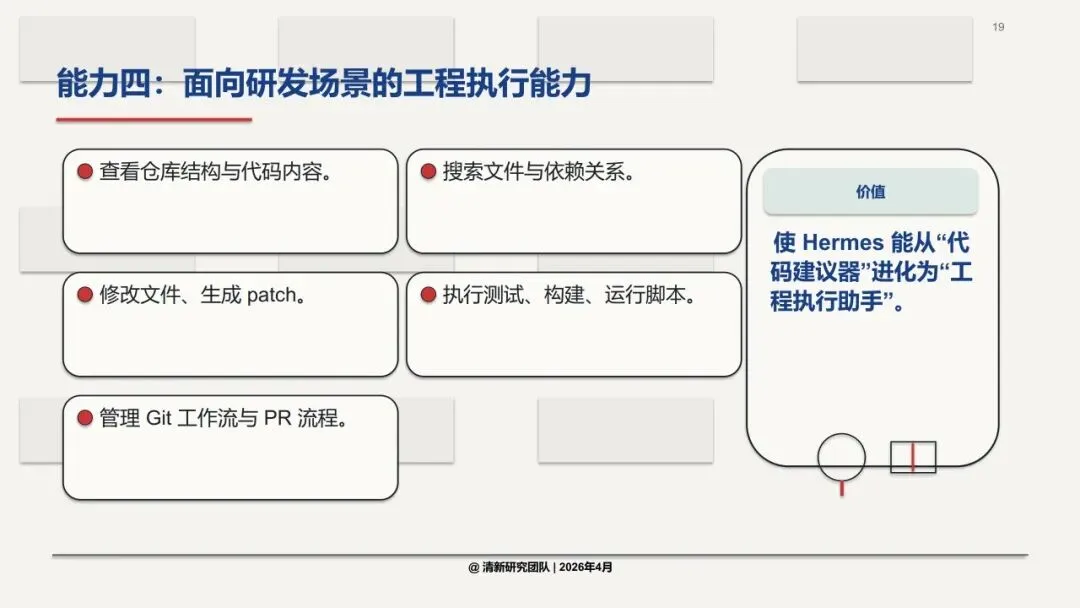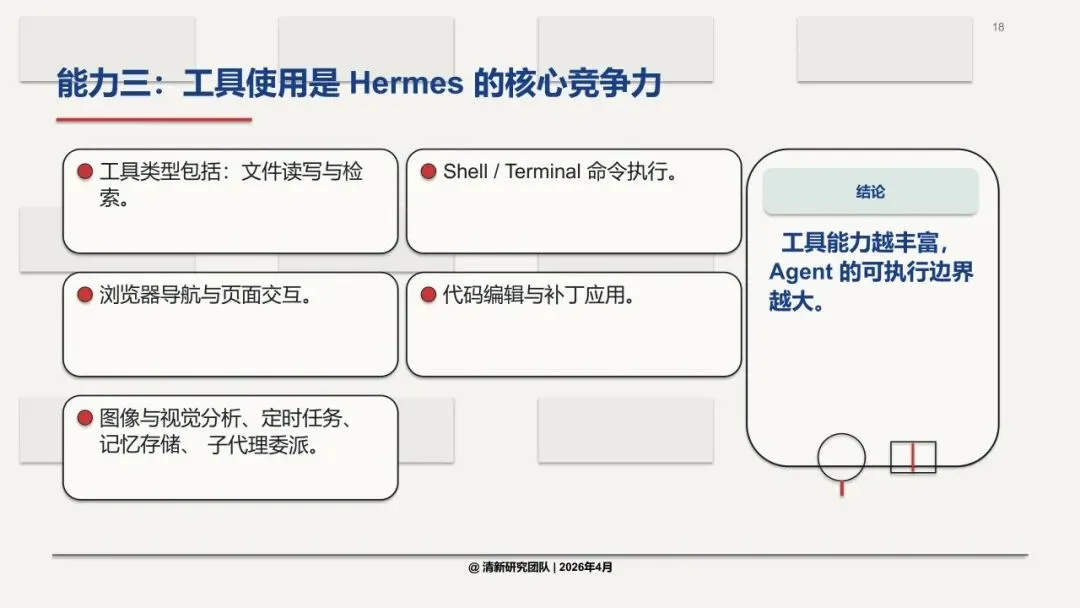 报告指出一个关键判断:未来Agent产品的竞争,不是“谁更聪明”,而是“谁更能执行、更可控”。Hermes的优势在于它是成品化Agent,工具齐全、约束明确、即用性强。