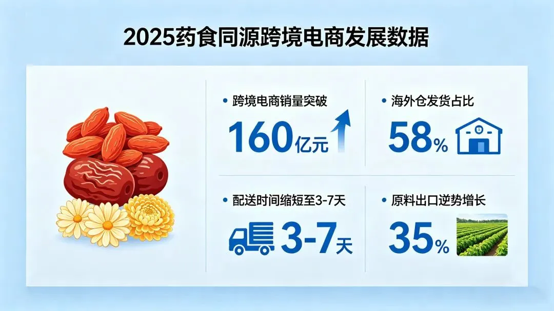 全球化进程持续提速,药食同源产业正从传统的原料出口,向高附加值成品出口、中医药文化输出转型,海外市场正成为行业发展的重要增量。2025年,药食同源产品在跨境电商销量突破160亿元,海外仓发货占比58%,配送时间缩短至3-7天;中国药食同源原料出口额同比大幅增长35%,远超同期中药类产品整体下滑5.6%的平均水平 。