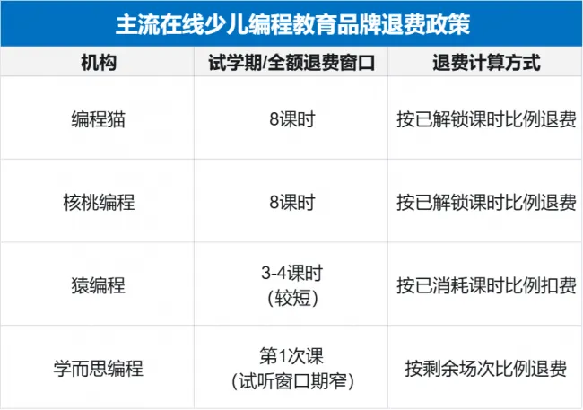 编程猫与核桃编程均提供长达8课时的试学期,给予家长更充分的决策空间,属于第一梯队。猿编程和学而思编程的窗口期相对紧凑。不过,所有机构在试学期结束后基本采用“用多少扣多少”的透明模式,但家长报名前仍需逐条阅读合同细则,这是任何“友好政策”都无法替代的自我保护。
