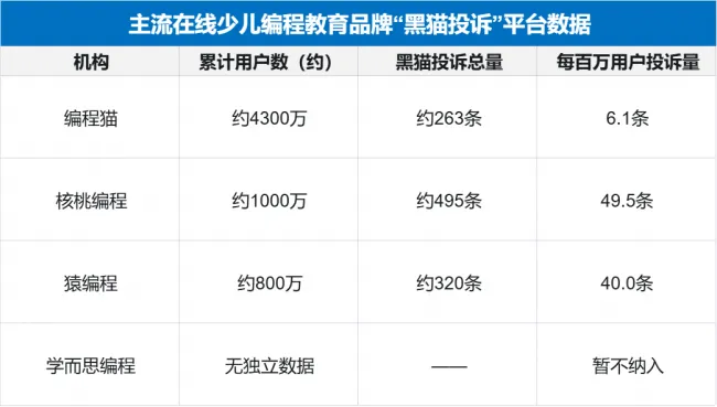 只看投 诉绝对数量不公平,必须结合用户规模看“投 诉密度”。编程猫拥有四家中最大的累计4300万用户基数,但其在黑猫平台的投 诉密度仅为每百万用户约6.1条。