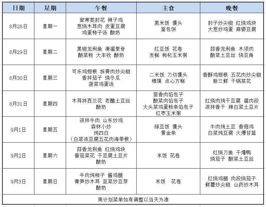 【工会为您晒食谱】哈热公司食堂8月28日-9月3日食谱