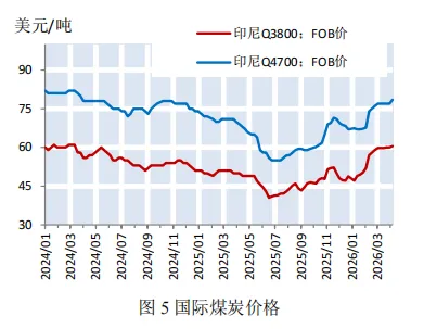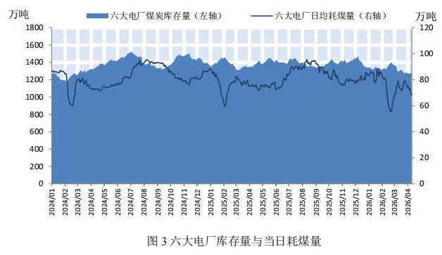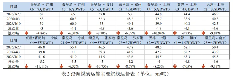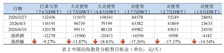 市场综述:沿海干散货运价指数小幅下降,散货船日租金指数大幅下跌上海航运交易所2026年4月10日发布的中国沿海干散货运价指数报收于1169.43点,较3月27日下降5.37%(如图1)。三大货种方面均小幅下降,其中煤炭运价降幅最大(如表1)。数据来源:上海航运交易所,上海国际航运研究中心整理上海航运交易所2026年4月10日发布的中国沿海散货船日租金指数(CDI)报收于2923.79点,较3月27日大幅下降13.88%(如图2)。各船型租金均呈下降态势,其中大灵便型(4.8万DWT)大幅下降18.81%至88128元/天(如表2)。数据来源:上海航运交易所,上海国际航运研究中心整理截至4月10日,沿海六大电厂的存煤量为1278.2万吨,较上期末微幅下降0.17%;日均耗煤量为68.26万吨,较上期末大幅下降13.17%;可用天数维持在18.7天左右,较上期增加2.5天(如图3)。数据来源:中国煤炭资源网,上海国际航运研究中心整理供给:国内煤价微幅上涨,国外煤价小幅上涨