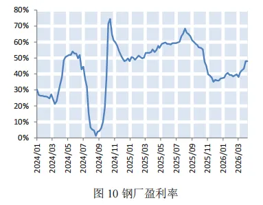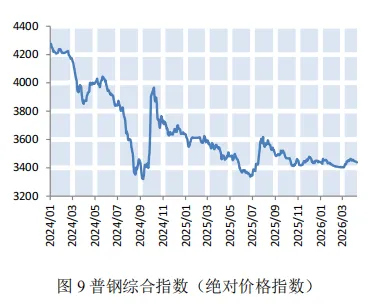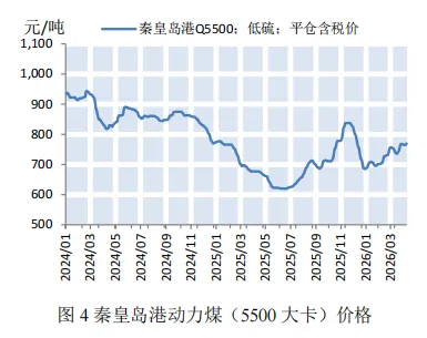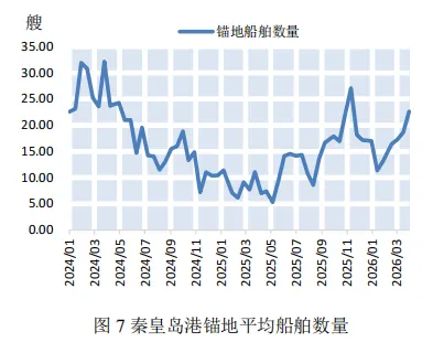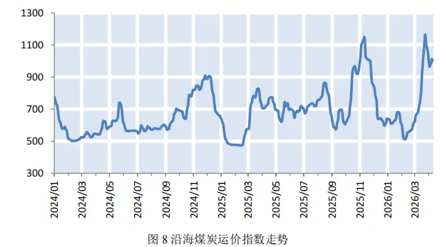 国内煤炭方面,煤价微幅上涨。截至4月10日,秦皇岛港Q5500动力煤现货价格报收于769元/吨,较上期微幅上涨0.13%(如图4)。进口煤价方面,煤价小幅上涨。截至4月10日,印尼Q3800动力煤FOB价报收于60.5美元/吨,较上期微幅上涨0.83%,印尼Q3800动力煤FOB价报收于78.5美元/吨,较上期小幅上涨1.95%(如图5)。数据来源:Mysteel,上海国际航运研究中心整理本期,北方港口库存大幅下降,铁路调入量小幅下降,水路调出量小幅上涨,总体上调入低于调出。本期(2026年3月28日-2026年4月10日)秦皇岛港口煤炭日均铁路调入量为53.06万吨,较上期(2026年3月14日-2026年3月27日)小幅下降9.73%;日均水路调出量59.34万吨,较上期小幅上涨9.62%;秦皇岛港内贸煤炭库存为633万吨,较上期大幅下降12.69%(如图6)。本期秦皇岛港锚地平均船舶数量23艘,较上期增加4艘(如图7)。数据来源:Mysteel,上海国际航运研究中心整理预测:各航线运价呈下降态势,预计下期运价将承压下行 本期全国多数地区气温持续回升,煤炭需求进入季节性淡季,叠加部分电厂陆续开展检修,日均耗煤量显著回落。同时,大秦铁路启动集中维修养护,煤炭集港效率有所下滑,沿海煤炭运价小幅下降。截至4月10日,上海航运交易所发布的沿海煤炭运价指数报收于1001.44点,较上期小幅下降8.81%(如图8)。下期,电厂以消耗库存为主,维持长协刚需采购,煤炭需求释放有限,预计下期沿海煤炭运价将承压下行。数据来源:上海航运交易所,上海国际航运研究中心整理需求:钢价微幅下降,钢厂盈利率小幅上涨
