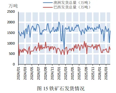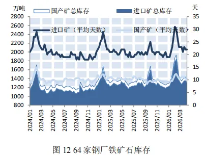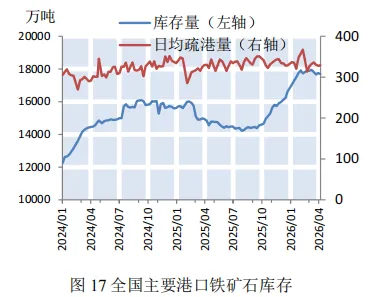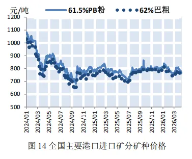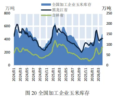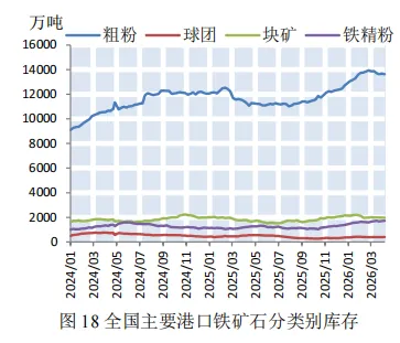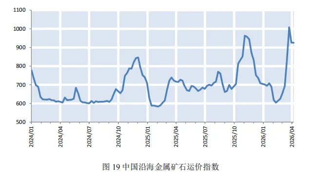 本期,钢材价格微幅下降。截至4月10日,普钢综合指数(绝对价格指数)报收于3439.01点,较上期微幅下降0.34%(如图9)。钢厂盈利率报收于48.05%,较上期小幅上涨4.76%(如图10)。数据来源:Mysteel,上海国际航运研究中心整理本期,钢厂高炉开工率小幅上涨。截至4月10日,全国调研的247家钢厂高炉开工率为83.2%,较上期小幅上涨2.17%(如图11)。本期,全国64家钢厂进口矿库存和国产矿库存均呈上涨态势。截至2026年4月10日,全国调研的64家钢厂进口矿库存1309.21万吨,进口矿平均可用天数22天,较上期减少1天;国产矿库存79.62万吨,国产矿平均可用天数10.26天,较上期减少0.57天(如图12)。数据来源:Mysteel,上海国际航运研究中心整理国产矿方面,本期国产矿价格小幅下降。截至4月10日,霍邱地区65%造球精粉价格指数报收于981点,较上期下跌15点(如图13);进口矿方面,本期进口矿价格小幅下降。截至4月10日,61.5%PB粉报收于766元/吨,较上期下降29元/吨;62%巴粗报收于738元/吨,较上期下降31.5元/吨(如图14)。截至4月10日,澳洲发货总量1588.2万吨,环比下降113万吨;巴西发货总量708.2万吨,环比上涨144.4万吨(如图15)。截至4月10日,全国186矿山样本产能利用率为61.13%,较上期小幅上涨2.09个百分点(如图16)。数据来源:Mysteel,上海国际航运研究中心整理本期,全国主要港口铁矿石库存微幅上涨,日均疏港量微幅下降。截至4月10日,全国主要港口铁矿石库存17693.48万吨,较上期上涨26.65万吨,日均疏港量329.23万吨,较上期微幅下降0.33%(如图17)。按品种分类,粗粉库存13631.57吨,较上期上涨4.68万吨;球团库存397.81万吨,较上期上涨5.15万吨;块矿库存1950.09万吨,较上期减少20.31万吨;铁精粉库存1714.01万吨,较上期上涨37.13万吨(如图18)。数据来源:Mysteel,上海国际航运研究中心整理数据说明:主要港口指包括青岛港、日照港等在内的全国30个主要铁矿石港口预测:铁矿石运价小幅下降,预计下期运价稳中偏弱运行本期,港口日均疏港量仍处于高位,港口库存高位累库,叠加终端采购需求清淡,而市场整体运力供给充足,沿海金属矿石运价小幅下降。截至4月10日,上海航交所发布的中国沿海金属矿石运价指数报收于925.69点,较上期小幅下降8.18%(如图19)。各航线运价均呈下降态势,其中北仑/舟山-张家港(4-5万DWT)航线运价大幅下降10.82%至23.9元/吨(如表4)。数据来源:上海航运交易所,上海国际航运研究中心整理下期,由于房地产依然疲软,终端旺季需求欠佳特征凸显。预计下期各航线运价稳中偏弱运行。供需:加工企业玉米库存大幅上升,北方港口玉米价格涨跌各异
