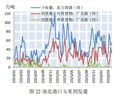 本期,北方港口下海量大幅下跌,南方港口内贸库存大幅上涨。本期(2026年3月28日—2026年4月10日)北方四港玉米下海量共计102.8万吨,较上期(2026年3月14日—2026年3月27日)减少35.9万吨;广东港口内贸玉米到货量为76.8万吨,较上期上涨55.1万吨;外贸玉米到货量为0万吨,较上期持平(如图22)。截至4月10日,广东港口内贸玉米库存49.4万吨,较上期上涨26万吨;外贸玉米库存10.2万吨,较上期减少4.5万吨(如图23)。本期,粮食深加工企业以刚需为主,贸易商收购积极性不高,北方玉米市场价格以下降态势为主,叠加港口集港量逐步下滑,沿海粮食运价小幅下降。截至4月10日,上海航交所发布的沿海粮食运价指数报收于1309.03点,较上期小幅下降1.24%(如图24)。各航线运价涨跌各异,其中营口-深圳(4-5万DWT)运价下降2.51%至70元/吨(如表5)。数据来源:上海航运交易所,上海国际航运研究中心整理下期,市场粮源整体充足,沿海粮食货盘释放缩减,粮食市场交投趋于清淡,预计下期沿海粮食运价震荡偏弱运行。