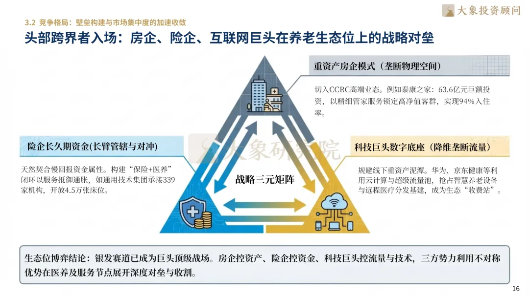 尽管坐拥万亿级规模,但供给侧仍呈现“高度碎片化”的原始状态,行业集中度(CR)极低,尚未形成跨品类的绝对头部。老年群体极高的信任成本成为转化的核心阻尼,决策深度依赖线下社区与熟人关系链,构建属地化“熟人信任生态”成为破局关键,领先企业借此可将月复购率拉升至惊人的65%。当前,头部跨界者已携不同基因入场对垒:险企如泰康保险依托长久期资金打造“保险+医养”闭环,其CCRC模式入住率可达94%;房企以重资产切入高端养老社区;科技巨头如京东健康、华为则规避线下重资产,以数字底座和流量优势抢占智慧养老入口。竞争壁垒已从“硬件设施”堆砌转向“精细化运营与服务粘性”的深度博弈,借助SaaS与AI系统,领先企业的运营人效可提升90%以上,行业正从区域性割据向全国性连锁进化,头部连锁品牌单店效能可达区域传统业态的8.6倍。