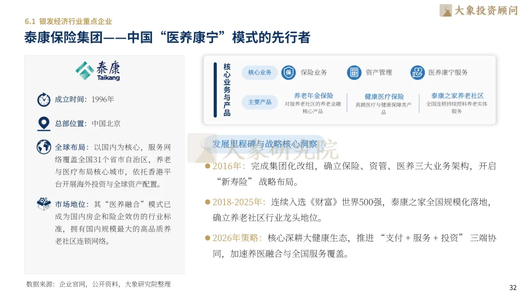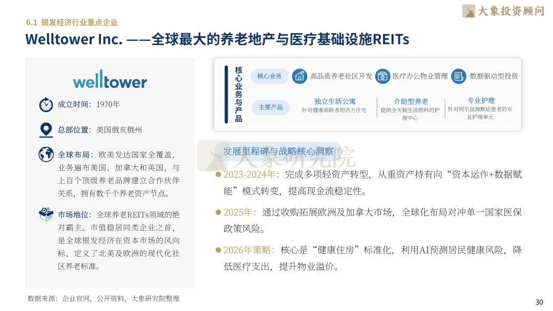 大象投顾凭借多年深耕的产业洞察,精准捕捉银发经济从“事业”到“产业”的认知转换节点,系统解构其增长内核。本报告深入剖析“新老人”的财富积累与消费心理迁移,聚焦智慧养老、康复器械、银发金融等核心赛道的商业闭环,并全景扫描Welltower、泰康、Sonova、悦心健康、九安医疗、奥佳华等中外领军企业的战略布局。通过拆解产业链的价值分配、竞争壁垒的演化与未来终局,为投资者与行业参与者提供具备前瞻性与实操价值的决策地图。