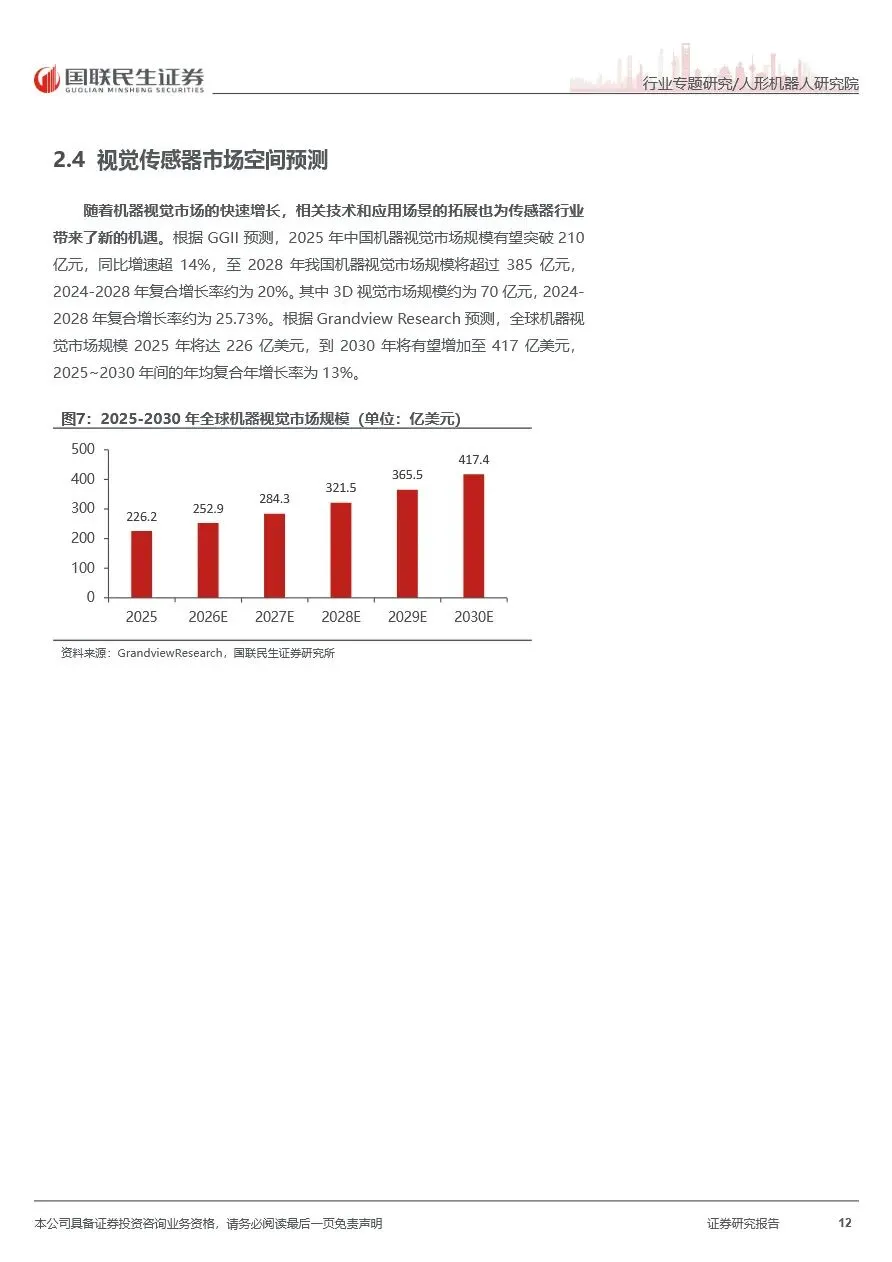 人形机器人行业的快速发展正驱动传感器市场持续扩展,尤其是视觉、力觉及触觉传感器领域迎来显著增长机遇。视觉传感器作为机器人感知环境的核心组件,3D视觉技术因其高精度物体识别与空间感知能力,正逐步成为工业和服务机器人领域的标配。力觉传感器方面,六维力传感器凭借其在高精度操作和人机交互中的关键作用,市场需求持续攀升,预计未来几年内将实现快速增长。触觉传感器则处于产业化早期,但随着机器人灵巧操作要求的提升,其作为高端机器人系统的核心感知模块,市场潜力巨大。