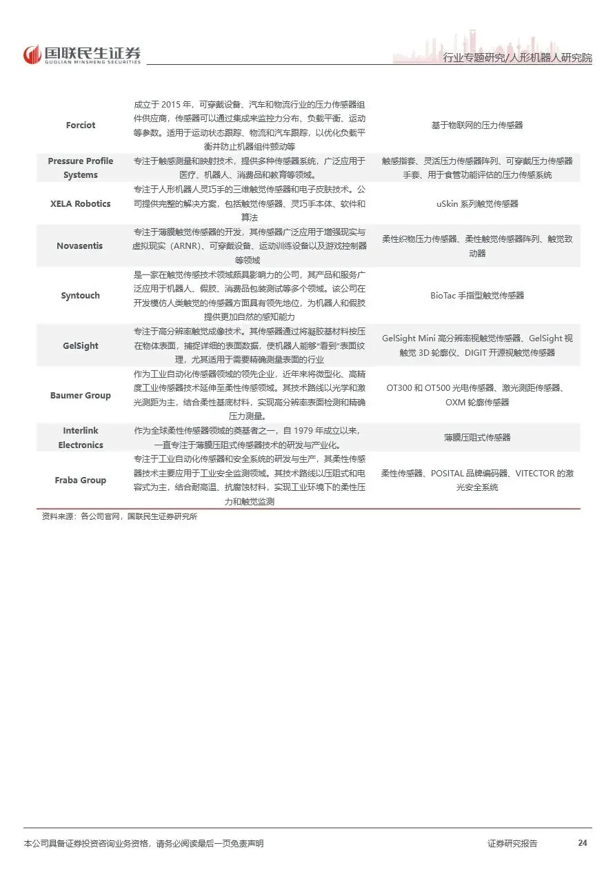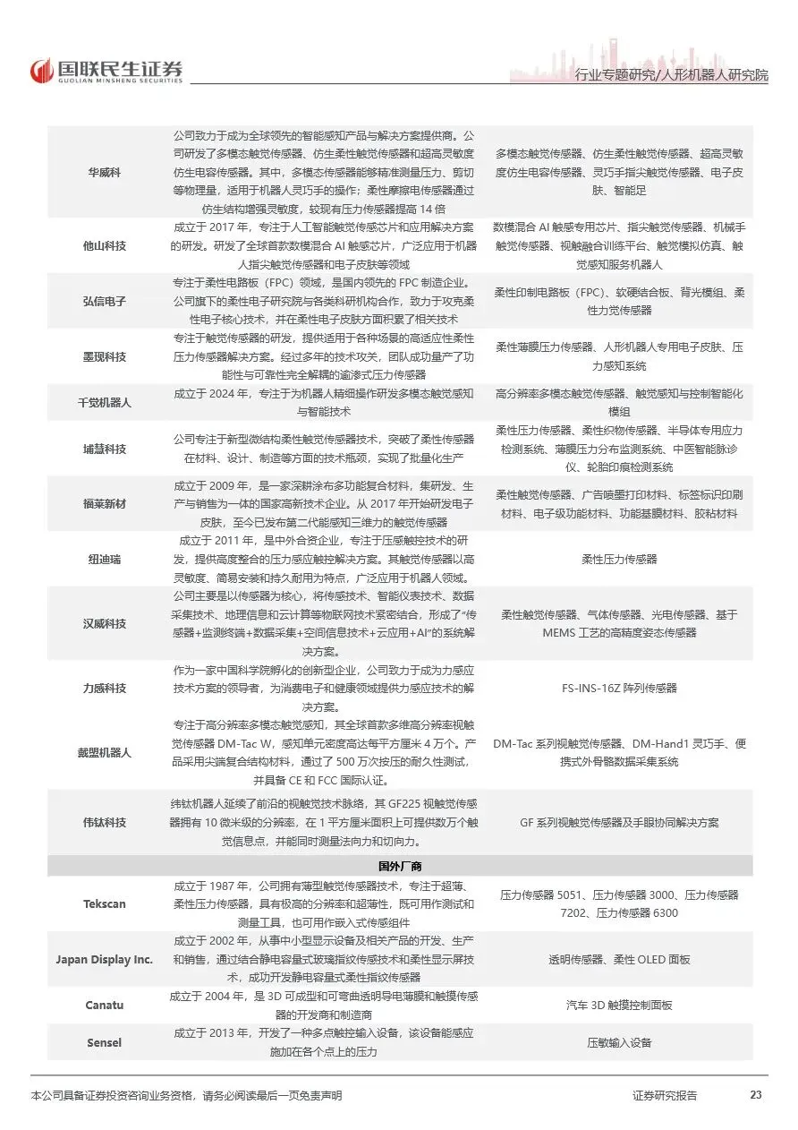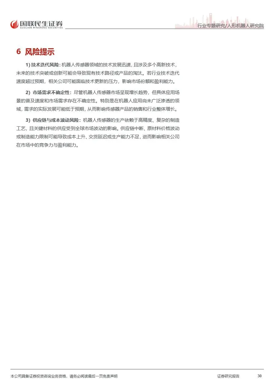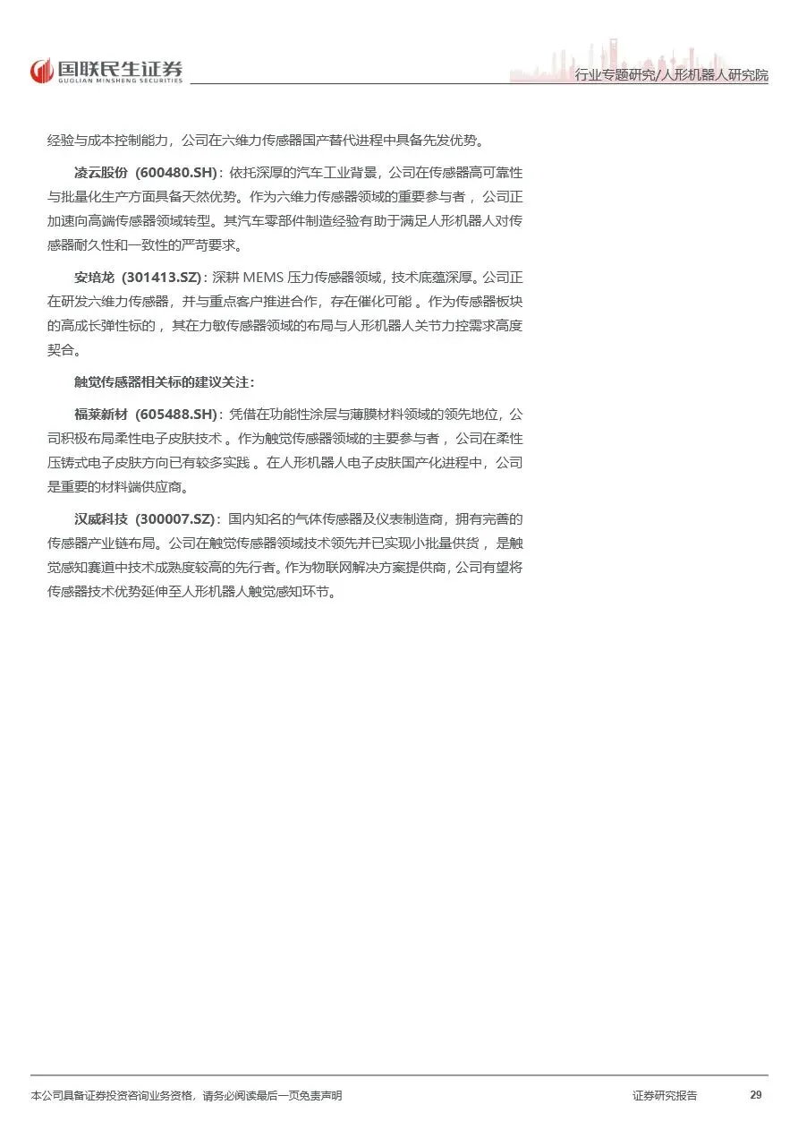 在人形机器人传感器市场中,国内外多家企业正积极布局并加速技术迭代。视觉传感器领域,海康威视、奥比中光等国内企业凭借全栈解决方案和高精度产品,逐步缩小与国际巨头的差距。力觉传感器方面,柯力传感、凌云股份等企业通过技术创新和规模化生产,推动六维力传感器成本下降,加速国产替代进程。触觉传感器领域,尽管海外厂商目前占据主导地位,但国内帕西尼、汉威科技等企业正积极布局,通过柔性阵列式、磁/霍尔阵列式及光学视触觉等多路径探索,推动触觉传感器技术向更高精度和更低成本方向发展。随着机器人应用场景的不断拓展,传感器市场将持续受益,迎来更广阔的发展空间。