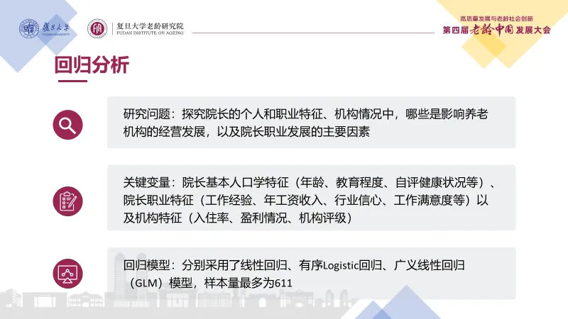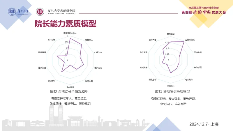 近日,复旦大学老龄研究院在上海举办第四届老龄中国发展大会,复旦大学老龄研究院副院长、中国社会福利与养老服务协会会长、课题组组长吴玉韶教授发布了《养老机构院长研究报告》(以下简称《报告》)。课题组在全国范围内开展专题调研,通过线上问卷调查(收集30个省,611份问卷)、个体深度访谈(面对面访谈34位院长)、多次召开线下座谈会等,收集一手数据,通过定量研究和质性研究,最终形成调研报告。据悉,该调研报告是国内第一份关于养老机构院长的较为全面和完整的实证研究报告。报告聚焦深描院长群体画像、能力素质模型,同时深入了解其管理的机构所面临的挑战以及院长期盼,在此基础上,为促进养老机构高质量发展,提升养老服务体系建设提供政策建议。《报告》绘制养老机构院长群像。在参与线上问卷调研的611位院长中,女性院长占比达60%。从年龄分布来看,70后和80后是养老机构院长群体的主力军,分别占34%(207人)和33%(201人)。83%的受访者获得大学专科及以上学历,43%的受访者拥有本科学历,硕士及以上学历占比为5%。并且,院长从业经验较为丰富,从业年限方面,66%(403人)的院长拥有5年以上的养老行业经验,从业经验在10年以上达到32%(195人)。从职业背景来看,养老机构院长在进入行业前多从事医疗、护理、健康等相关领域。加入养老行业前,从事企业管理者、护理人员和行政人事工作的人员较多。大多数院长在任职前曾在养老机构担任行政管理或护理岗位超过6个月。90%的院长自评健康好;院长自述每周平均工作6.25天,每天工作时间约10小时;81%的受访院长年收入低于15万元,超九成的院长对养老行业充满信心,对养老行业前景乐观是择业首要动机。总之,院长是一群工作时间较长、收入不太高,但工作满意度很高的群体。《报告》首次公布了院长能力素质模型,围绕合格院长需具备的“知识、技能、价值观和特质”四大方面,对院长综合能力评价和进一步能力提升,具有指导意义。通过线性回归发现:入住率与院长收入、院长信心、机构运营年限正相关;通过Logistic回归发现:院长年龄、机构运营年限与机构评级正相关,“盈亏平衡”和“亏损”的机构评级相对较低。通过广义线性回归(GLM)发现,年龄、每日工作时长、行业信心等对院长晋升有显著影响;受教育水平、行业信心对院长收入有显著影响。调研显示,基于我国人口老龄化趋势推动养老需求的不断提升,以及国家对养老的重视与政府支持等因素,超九成院长对养老行业的发展有信心。但与此同时,养老机构高质量发展也面临一些共性挑战,主要有:政府部门多头监管加重机构负担,人力资源短缺导致运营管理压力大,社会公众对养老机构认知存偏差,养老行业扶持政策地域城乡落实不均。《报告》指出,2024年被业界称为“银发经济”元年,如何抓住发展契机,推动养老机构高质量发展,院长们对未来发展有“六盼”。 一盼综合监管标准统一,《报告》指出,亟需完善各层级、各部门间的协调衔接机制,确立统一的标准与规范,削减冗余的重复检查与报表要求,以保障监管工作的一致性与有效性,进而有效减轻养老机构的运营负担。 二盼智慧科技助力养老,在当前信息化、大数据和人工智能时代背景下,加大智慧养老研发投入力度,引导更多机构使用智慧养老技术,可极大提升管理效率。 三盼良好的舆论环境,通过多方努力与合力,消解公众误解偏见,提升养老行业的认可度与接纳度,营造有利的舆论环境。养老机构也可尝试打造自媒体平台,建立运营传播矩阵,开展品牌传播等。四盼清晰的职涯发展路径,目前我国尚缺乏针对院长的清晰的职业生涯发展路径规划,下一步,在完善院长能力素质模型,明确职业化的准入门槛,构建专业化、系统化的培养体系,建立更多官方认可、高层次的学习交流平台等方面都大有可为。 五盼完善的法律法规,我国尚缺专门针对养老机构维权的法律法规,遭遇“养闹”等情况较难处理。因此,应进一步完善养老服务机构立法,为养老机构提供必要的法律保护,确保其在面对各类复杂情境时,能够有法可依、有章可循,从而保障养老服务业的健康、稳定与可持续发展。六盼养老金融创新支持机构发展,特别在养老产业金融方面,期盼金融机构积极探索新模式,加大对轻资产为主的智慧科技养老企业、中小机构的帮扶力度,解决“融资难”问题;进一步推动养老REITs发展。2024年初,复旦大学成立课题组,围绕养老服务体系的中坚力量——养老机构院长开展研究,并举办了第一期“闻道”养老机构院长高级研修班,携手中国社会福利与养老服务协会举办首届中国养老院院长大会。康养焦点