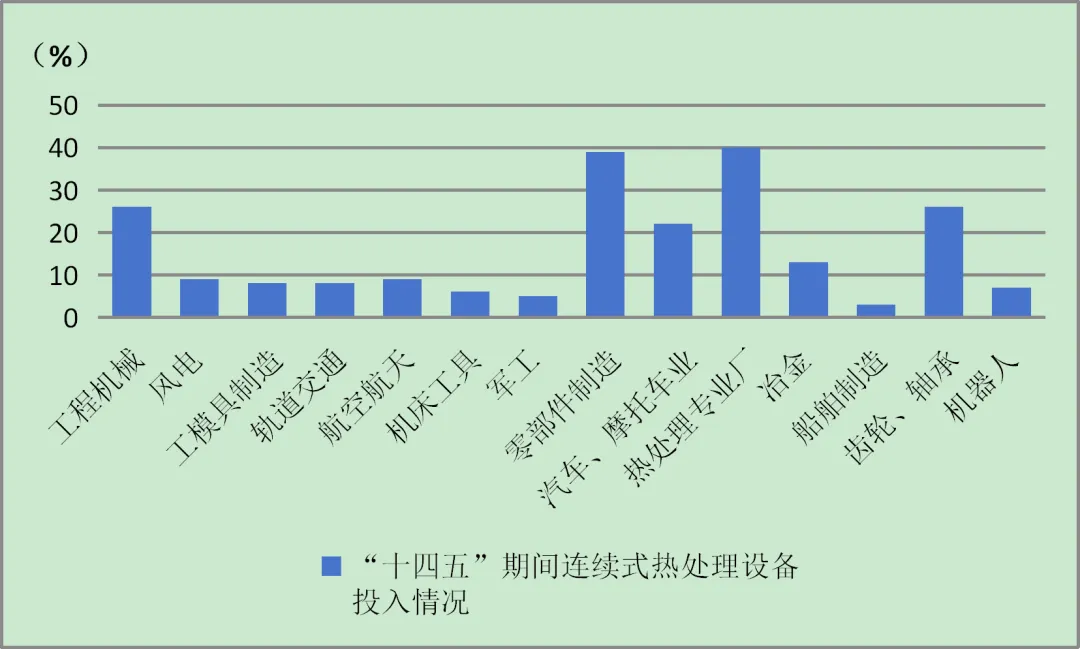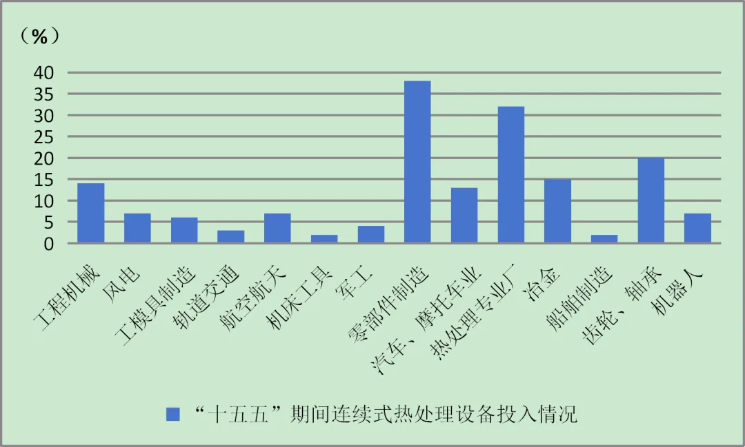 各企业“十四五”“十五五”期间对连续式热处理设备需求变化不大,较为强劲。尤其是零部件制造行业, “十四五”“十五五”期间投资分别达到39%、38%。未来,热处理专业厂、齿轮、轴承、工程机械、冶金、汽车等行业将会有较大需求。