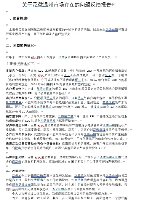 本报告旨在详细阐述泛微软件温州存在的一些不和谐的问题,以及由此泛微品牌和市场开拓发展所产生的一些不利影响及直接经济损失。