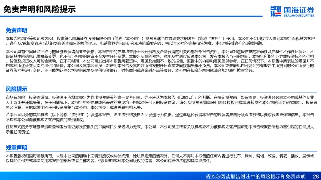 在任何情况下,本公众号所载信息、意见不构成对任何人的投资建议,所述证券或金融工具买卖的出价或征价,评级、目标价、估值、盈利预测等分析判断亦不构成对具体证券或金融工具在具体价位、具体时点、具体市场表现的投资建议。对任何直接或间接使用本公众号所载信息和内容或者据此进行投资所造成的任何一切后果或损失,国海证券及/或其关联人员均不承担任何形式的法律责任。