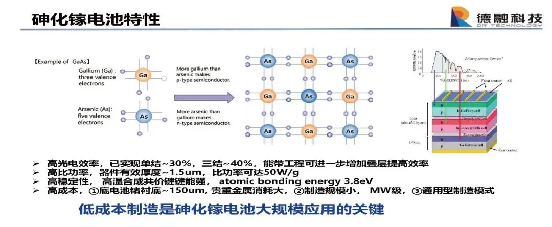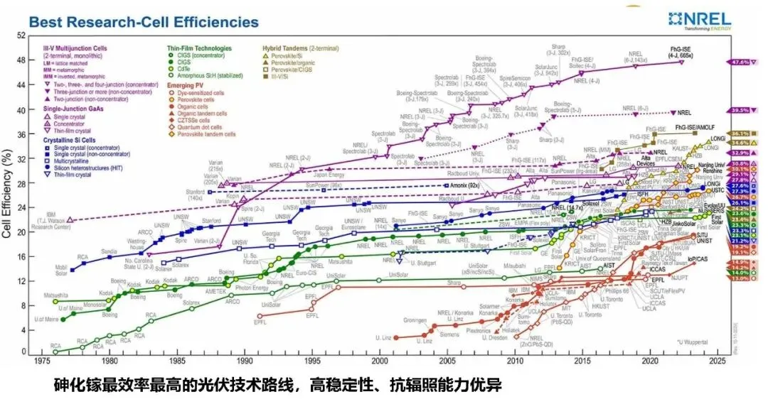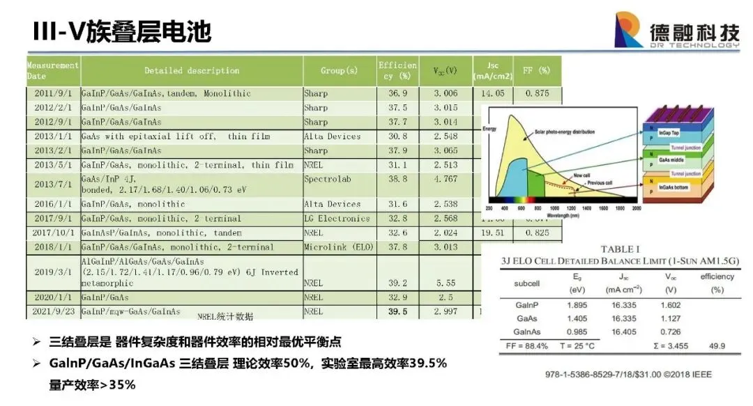 1,高光电效率,已实现单结~30%,三结~40%,能带工程可进一步增加叠层提高效率;