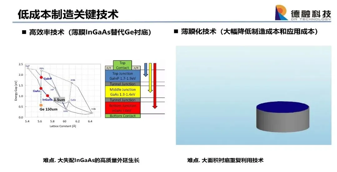 1,高效率技术(薄膜InGaAs替代Ge衬底),难点:大失配InGaAs的高质量外延生长;