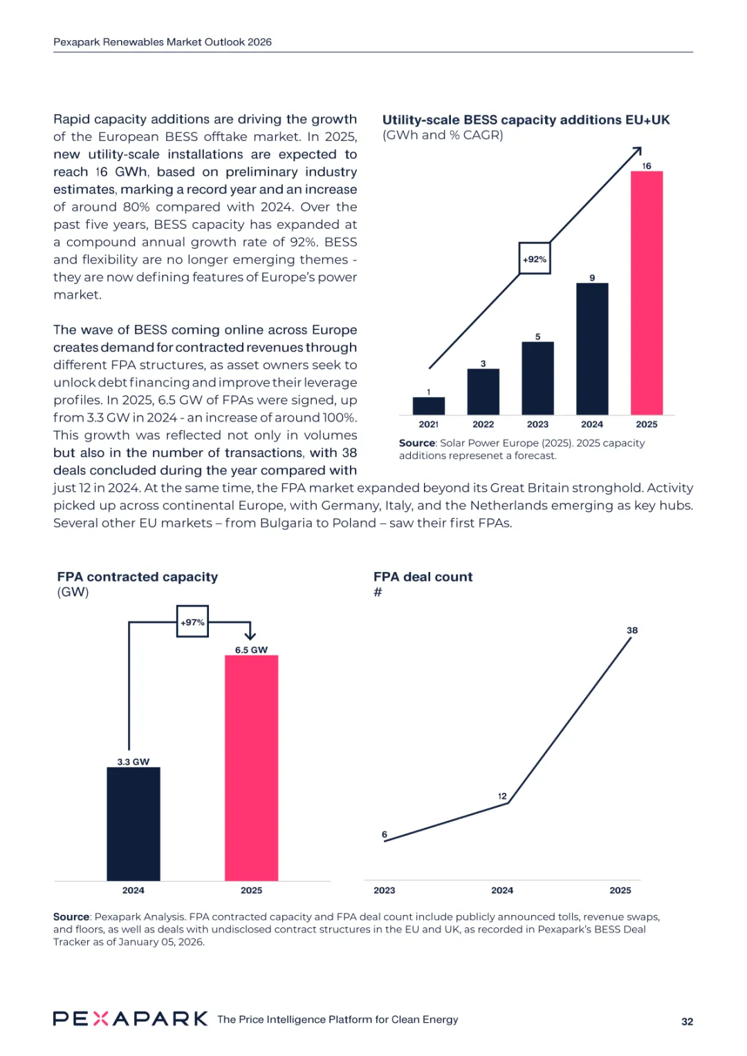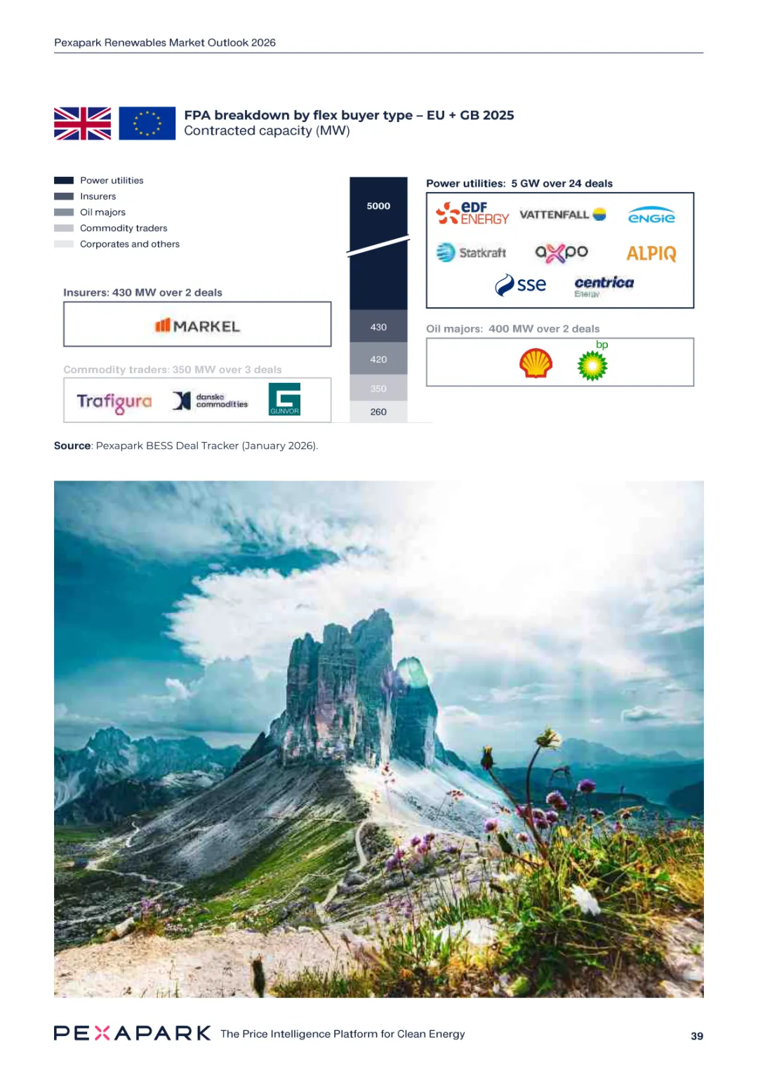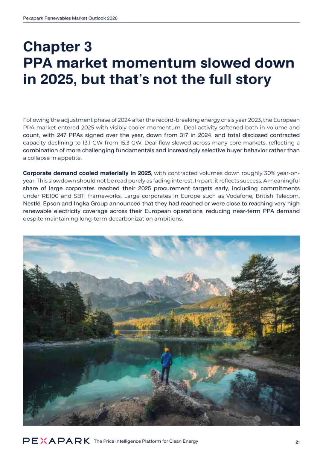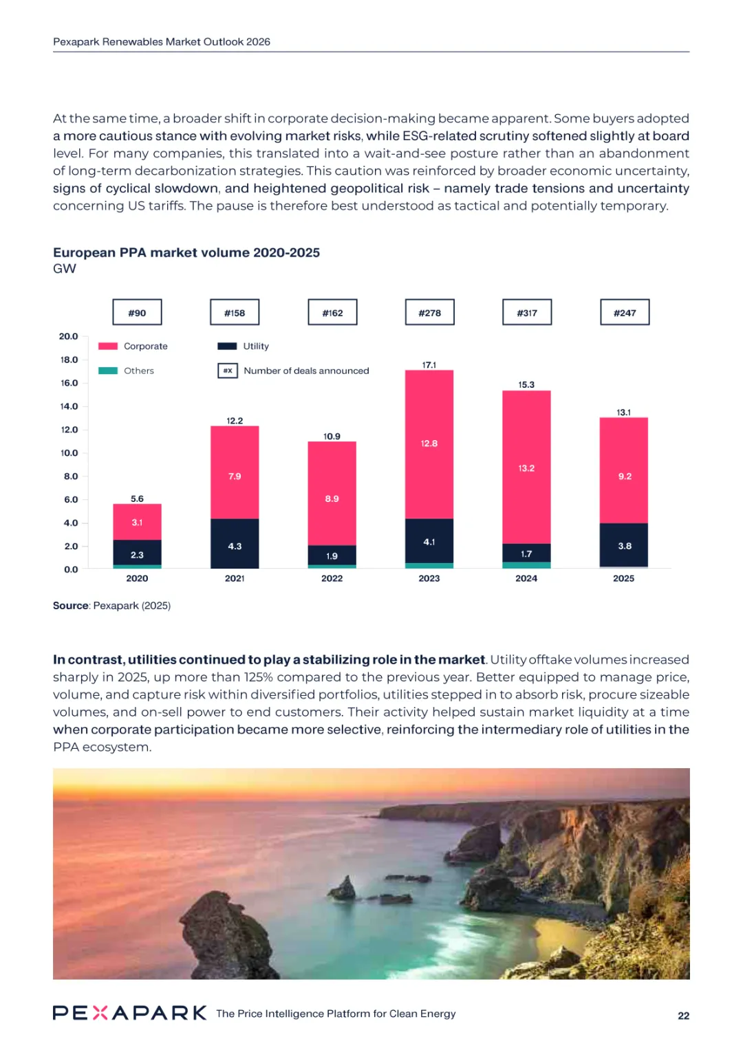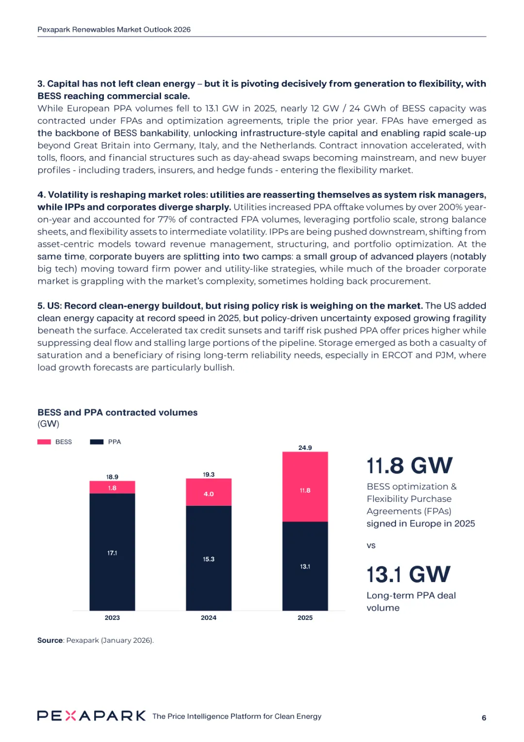 2025 年欧洲电力系统迈入可再生能源主导阶段,风光发电量占比持续提升。市场进入大规模价值重估周期,发电捕获率下滑,电价波动与负电价成为常态。长期购电协议市场逻辑重构,资产估值与收益模式迎来深度调整。欧洲购电协议签约量有所回落,电池储能采购协议实现三倍增长。灵活性采购协议成为储能项目融资核心支撑,合同模式持续创新。 utilities 凭借资产组合与风险管控能力,成为市场风险承接主体。独立发电商转向收益管理与资产组合优化模式。企业采购群体出现分化,科技行业保持稳定需求,普通企业采取观望态度。美国市场装机规模创新高,政策变动带来价格上行压力。储能项目受益于电网可靠性需求,保持快速增长态势。报告预测 2026 年捕获率将继续走低,储能相关合同量突破 10GW。市场主体加快适应波动环境,价值挖掘重心转向灵活性与风险管控。
