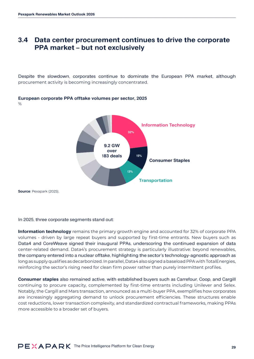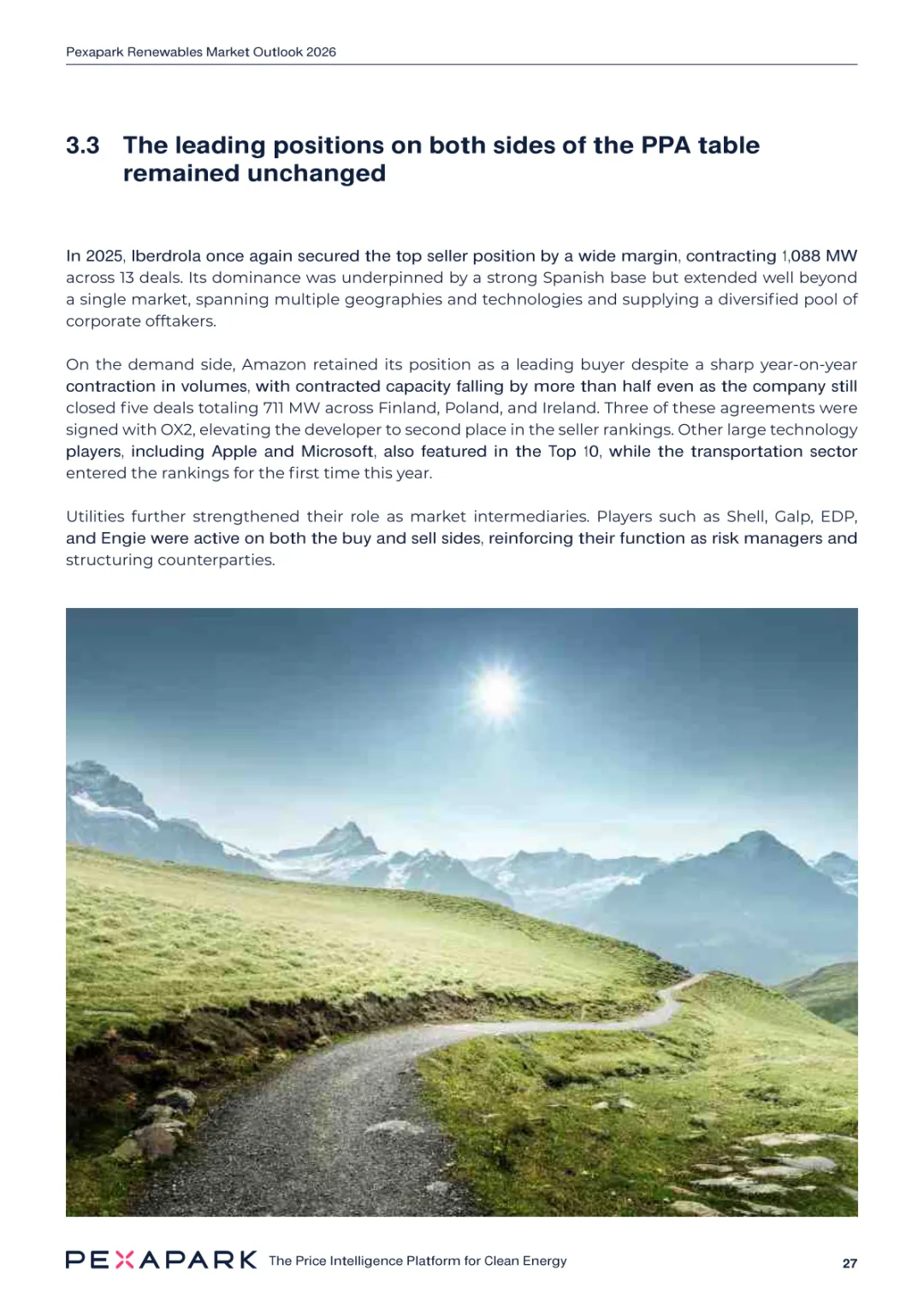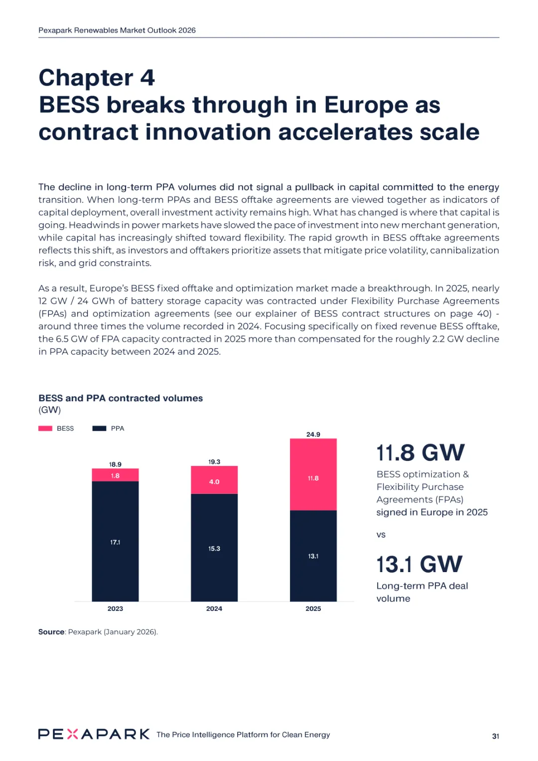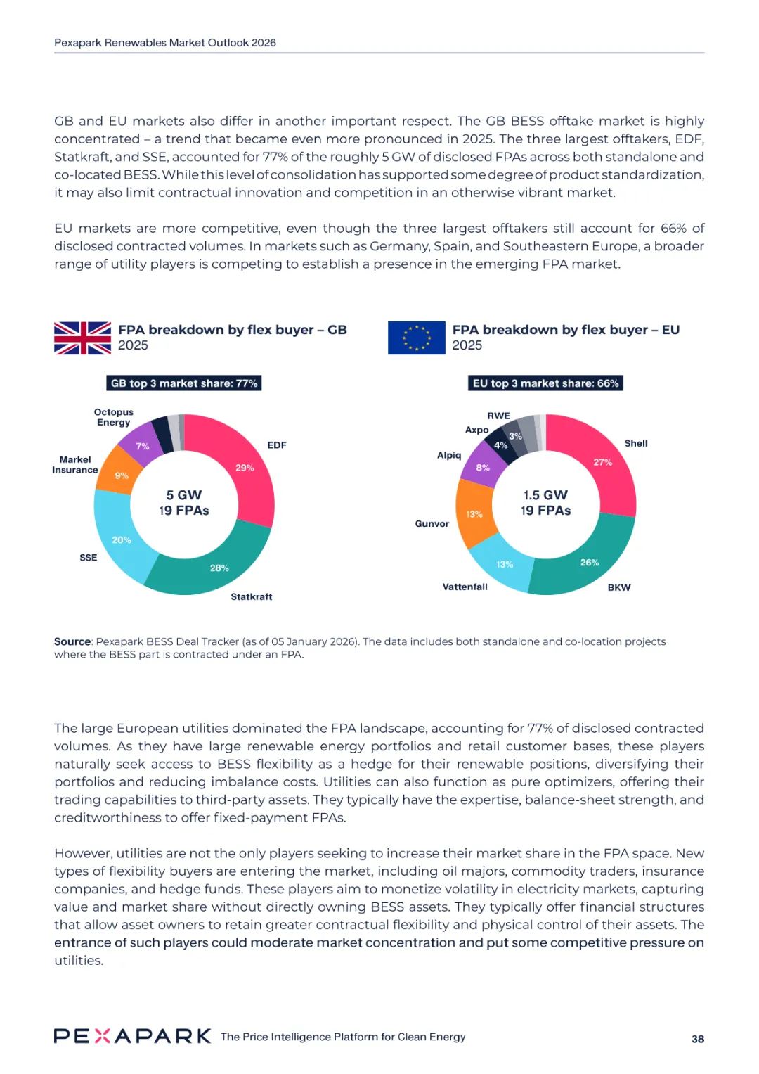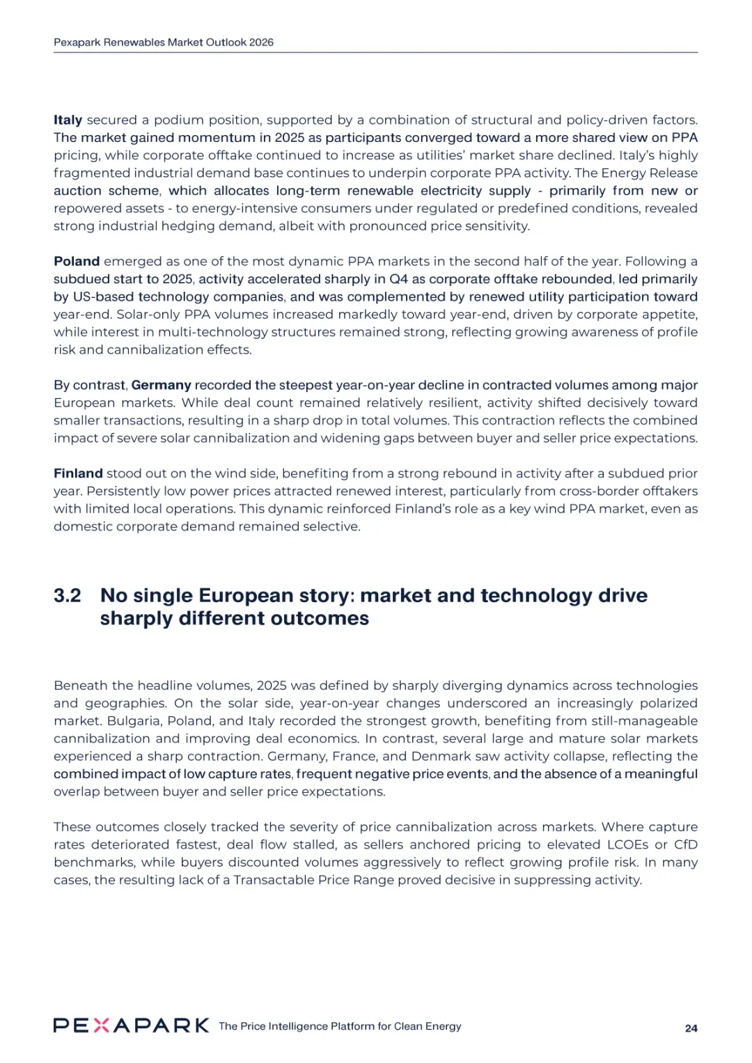 2025 年欧洲电力系统迈入可再生能源主导阶段,风光发电量占比持续提升。市场进入大规模价值重估周期,发电捕获率下滑,电价波动与负电价成为常态。长期购电协议市场逻辑重构,资产估值与收益模式迎来深度调整。欧洲购电协议签约量有所回落,电池储能采购协议实现三倍增长。灵活性采购协议成为储能项目融资核心支撑,合同模式持续创新。 utilities 凭借资产组合与风险管控能力,成为市场风险承接主体。独立发电商转向收益管理与资产组合优化模式。企业采购群体出现分化,科技行业保持稳定需求,普通企业采取观望态度。美国市场装机规模创新高,政策变动带来价格上行压力。储能项目受益于电网可靠性需求,保持快速增长态势。报告预测 2026 年捕获率将继续走低,储能相关合同量突破 10GW。市场主体加快适应波动环境,价值挖掘重心转向灵活性与风险管控。