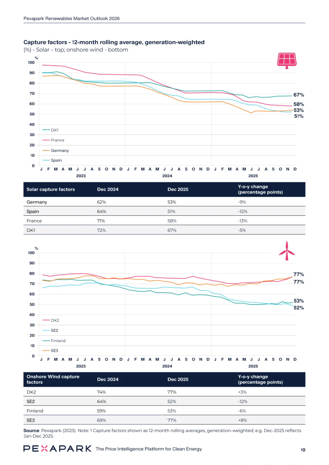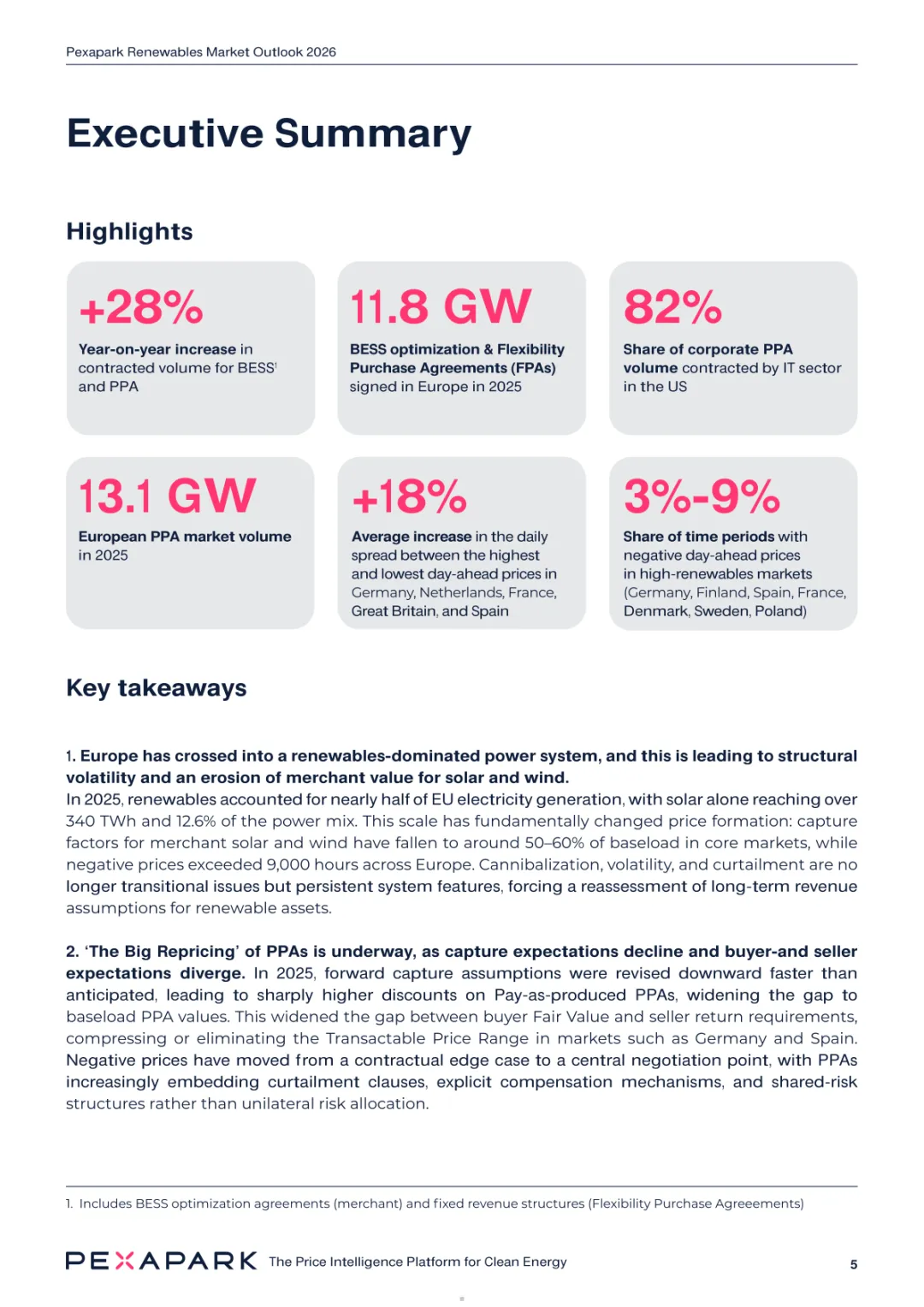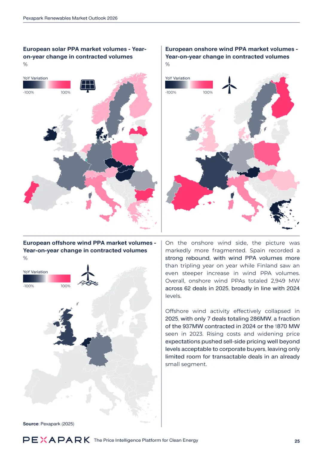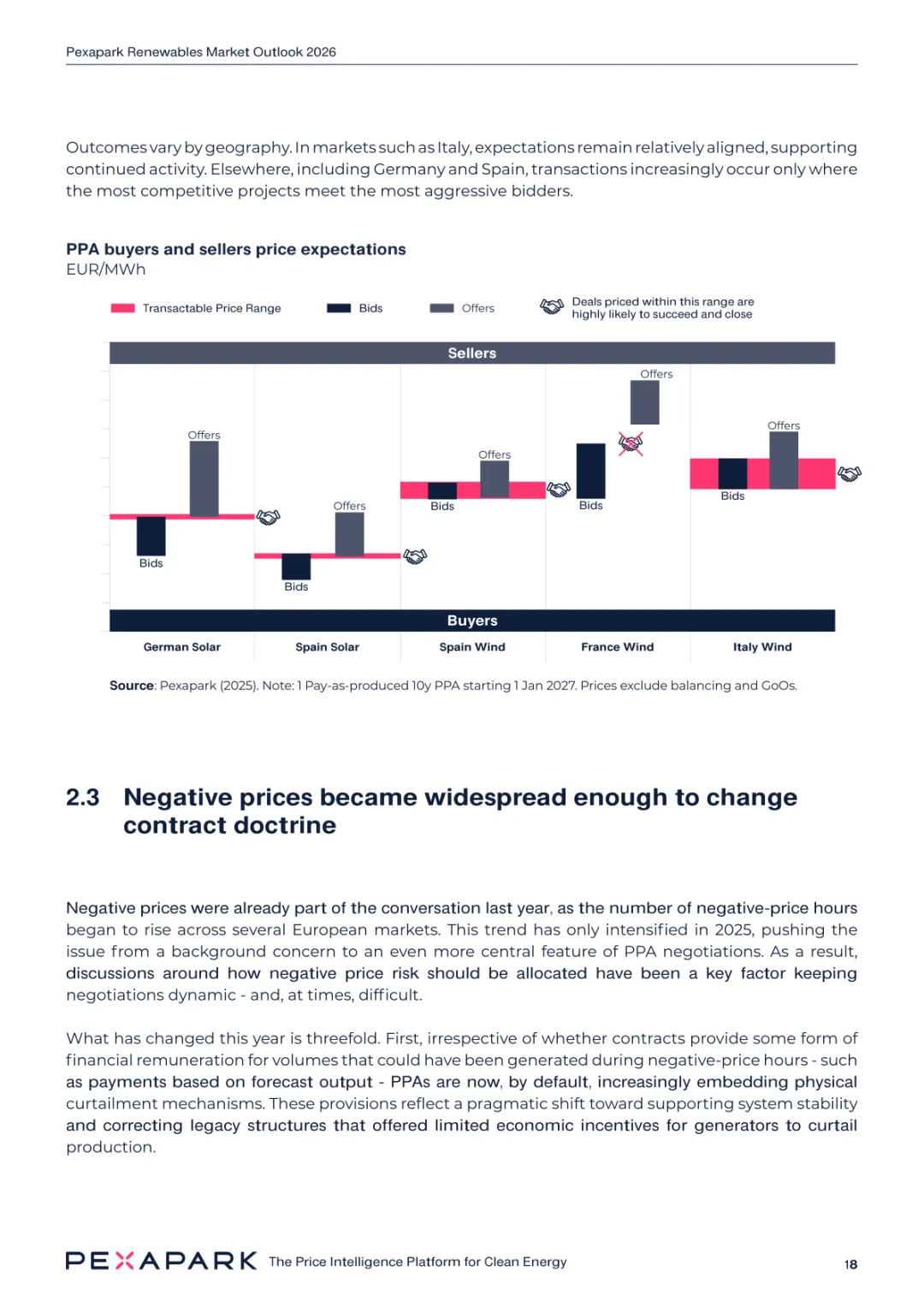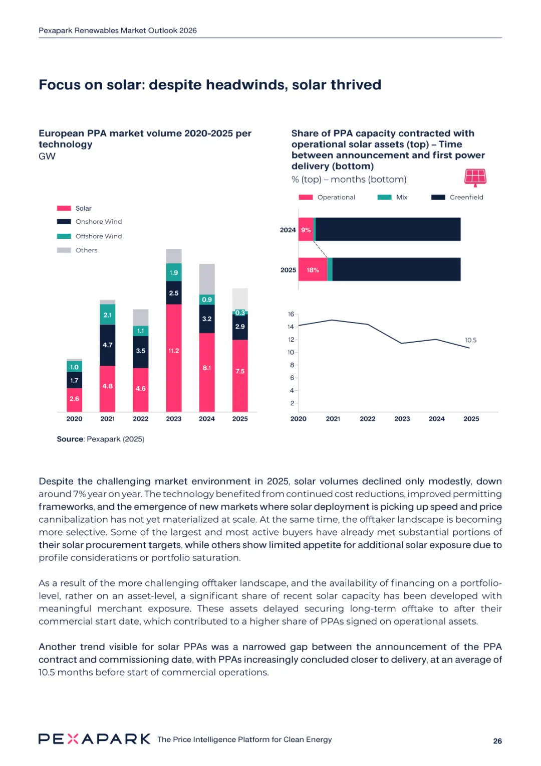 2025 年欧洲电力系统迈入可再生能源主导阶段,风光发电量占比持续提升。市场进入大规模价值重估周期,发电捕获率下滑,电价波动与负电价成为常态。长期购电协议市场逻辑重构,资产估值与收益模式迎来深度调整。欧洲购电协议签约量有所回落,电池储能采购协议实现三倍增长。灵活性采购协议成为储能项目融资核心支撑,合同模式持续创新。 utilities 凭借资产组合与风险管控能力,成为市场风险承接主体。独立发电商转向收益管理与资产组合优化模式。企业采购群体出现分化,科技行业保持稳定需求,普通企业采取观望态度。美国市场装机规模创新高,政策变动带来价格上行压力。储能项目受益于电网可靠性需求,保持快速增长态势。报告预测 2026 年捕获率将继续走低,储能相关合同量突破 10GW。市场主体加快适应波动环境,价值挖掘重心转向灵活性与风险管控。