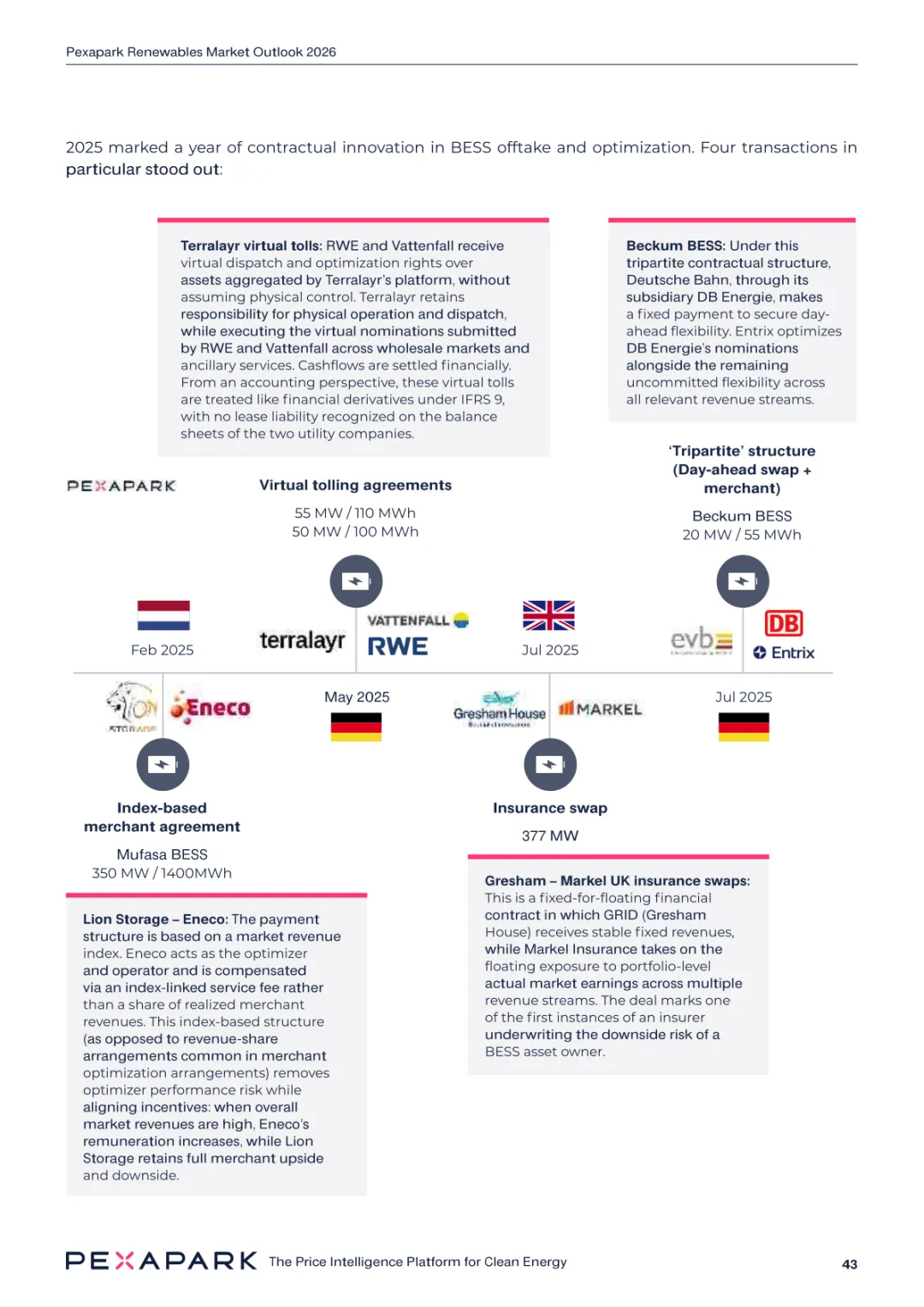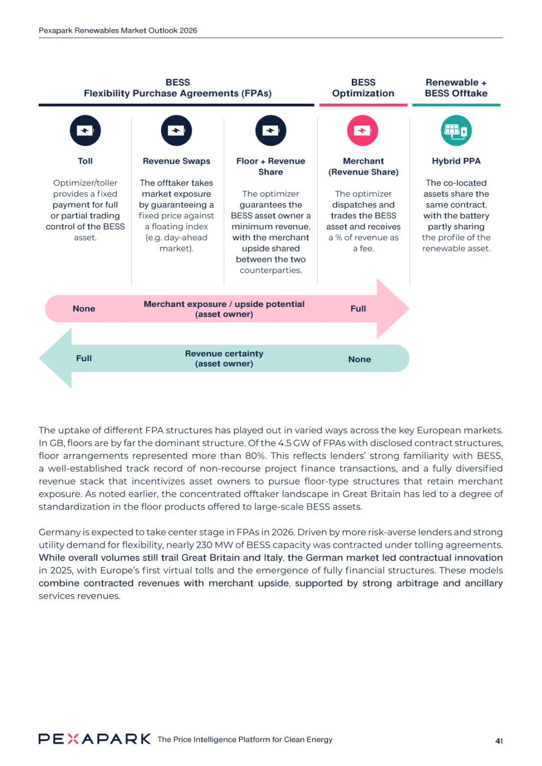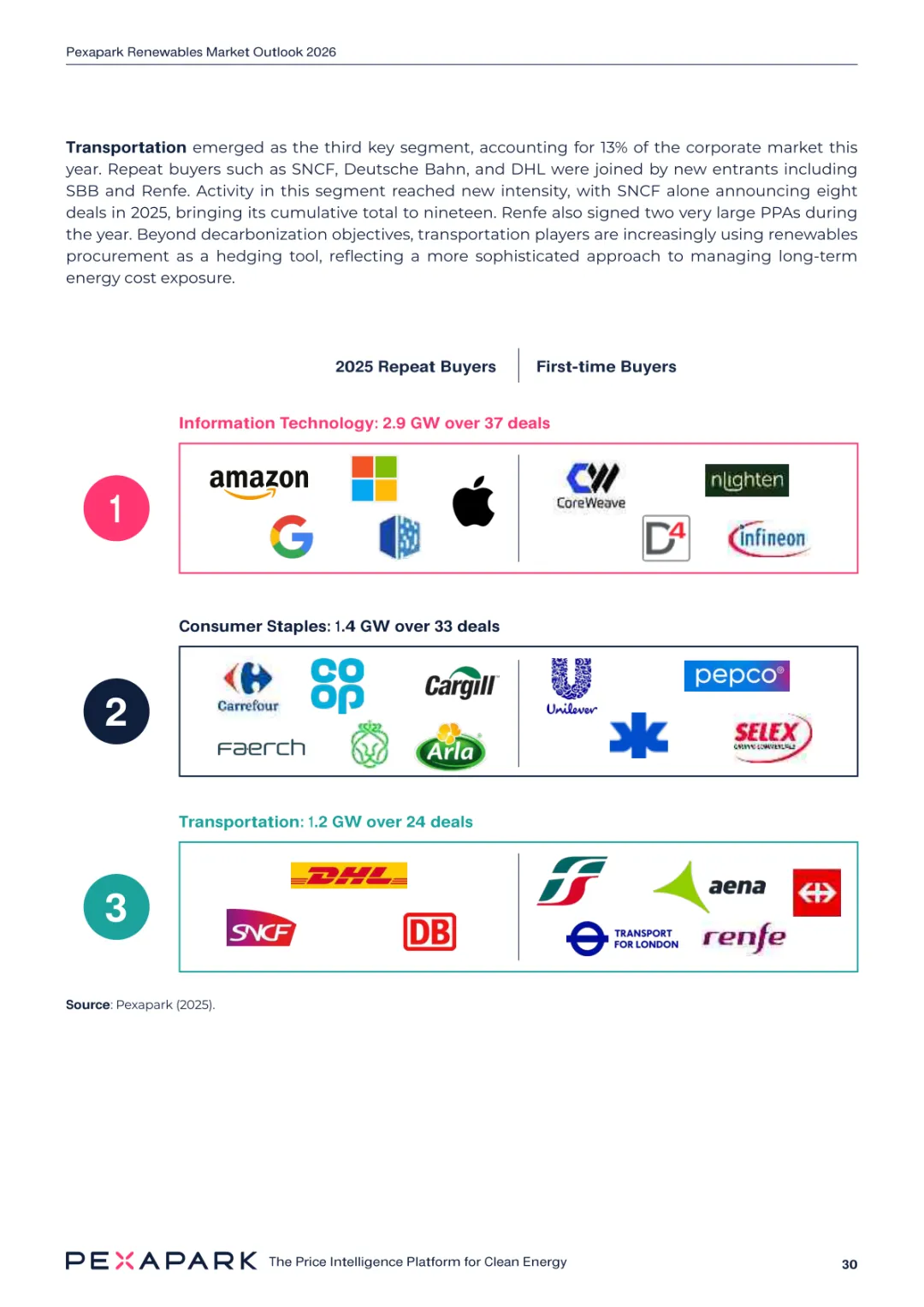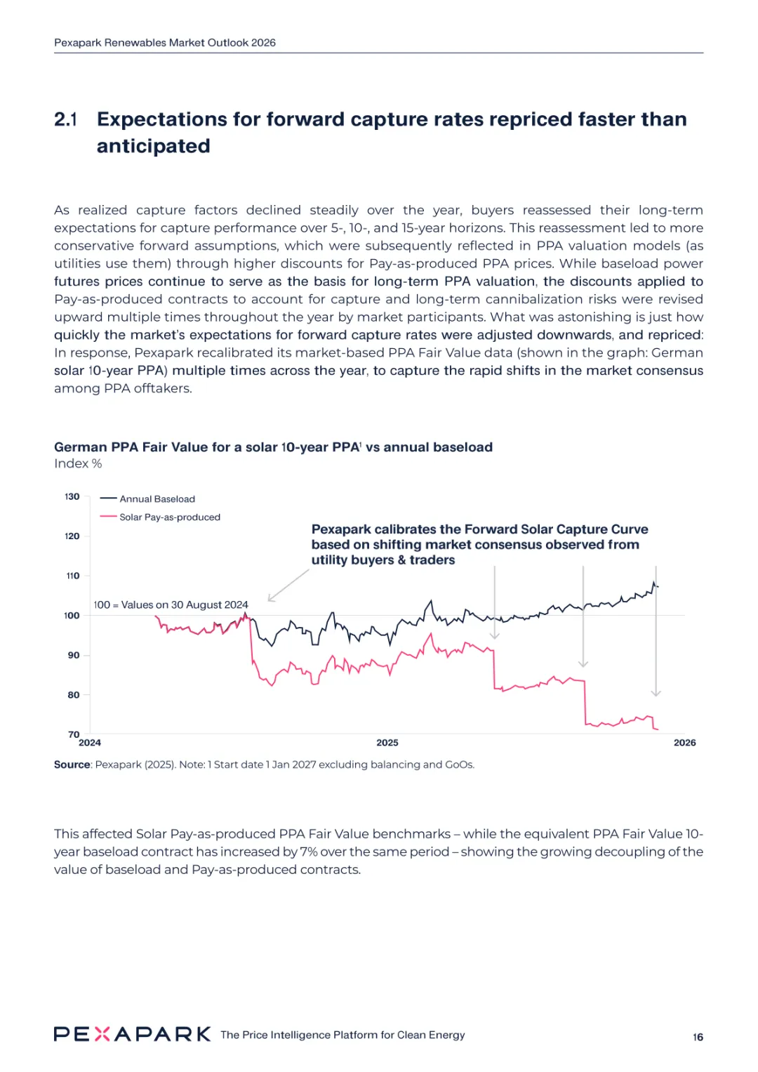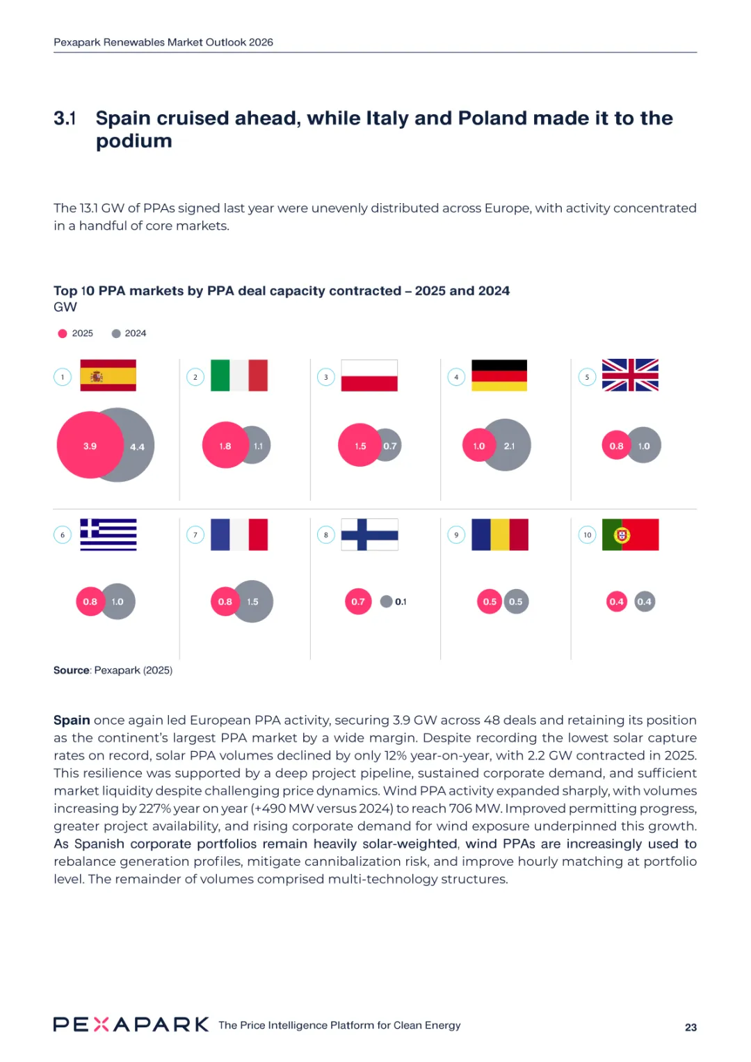 2025 年欧洲电力系统迈入可再生能源主导阶段,风光发电量占比持续提升。市场进入大规模价值重估周期,发电捕获率下滑,电价波动与负电价成为常态。长期购电协议市场逻辑重构,资产估值与收益模式迎来深度调整。欧洲购电协议签约量有所回落,电池储能采购协议实现三倍增长。灵活性采购协议成为储能项目融资核心支撑,合同模式持续创新。 utilities 凭借资产组合与风险管控能力,成为市场风险承接主体。独立发电商转向收益管理与资产组合优化模式。企业采购群体出现分化,科技行业保持稳定需求,普通企业采取观望态度。美国市场装机规模创新高,政策变动带来价格上行压力。储能项目受益于电网可靠性需求,保持快速增长态势。报告预测 2026 年捕获率将继续走低,储能相关合同量突破 10GW。市场主体加快适应波动环境,价值挖掘重心转向灵活性与风险管控。