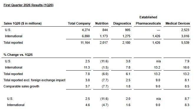2026年4月16日,雅培(NYSE:ABT)公布截至2026年3月31日的第一季度财务业绩。公司收入111.64亿美元,同比增长3.8%。除营养板块外,诊断、成药和医疗设备板块均呈现增长。