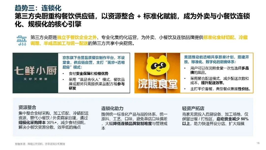 央厨的市场需求仍在持续扩大,但稳定的大订单增长有限,订单结构逐渐走向分散,这对供应链企业的柔性生产能力和快速响应能力提出了更高要求。第三方央厨凭借资源整合和标准化赋能,成为外卖和小餐饮连锁化规模化的核心引擎。