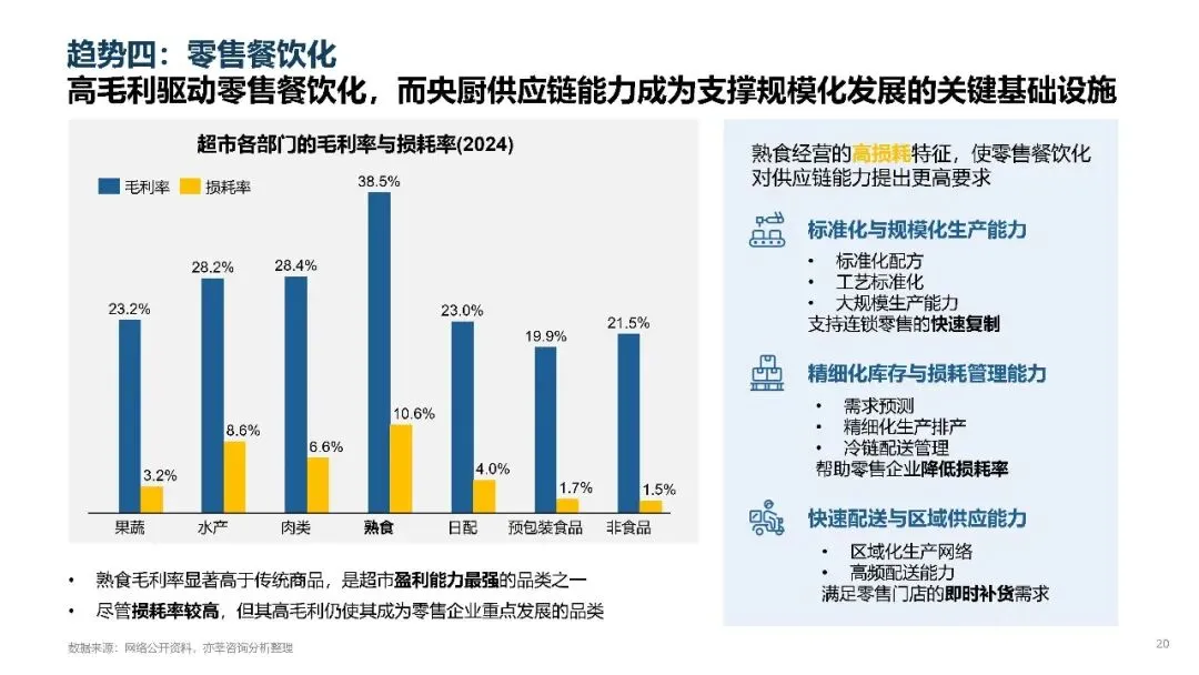高毛利驱动零售企业加速布局餐饮化业务,但门店生产能力难以满足日益增长的熟食 SKU 需求,生产流程复杂,人工成本高,产品保质期短等问题日益突出。这推动了商超餐饮生产从门店向中央厨房集中,外部供应链的依赖度显著提升,央厨供应链企业的市场需求进一步扩大。零售餐饮化对央厨的标准化规模化生产能力,精细化库存与损耗管理能力,以及快速区域配送能力都提出了更高要求。