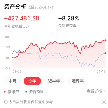 这样的仓位能够让我心态平和地度过周末,晚上也能睡得安稳。人还是要知足常乐的好,连华人股神段永平先生都说过“长期来看8%的年化收益率其实已经不错了”。现在才到4月份,而我这个账户的年内收益率就已经达到8%了,所以我是做好了净值不动如山的心理准备的。