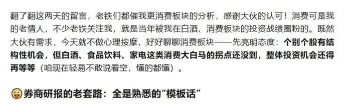 当然,在解读财报之前,还是先看看我曾经对于某些事物的判断吧,看看我到底有没有所谓的判断能力吧。在今年3月10号,各路券商大力鼓吹股王茅台的渠道政策改革红利、消费股便宜、消费股拐点到来之际……当时,我的后台不断有老铁私信我能否买入消费类的个股和ETF基金时,我坚定地表示暂时不要动手,并为此写过一篇文章:消费板块拐点来了吗——别被研报忽悠,关注结构性机会。该文章的核心观点截图如下: