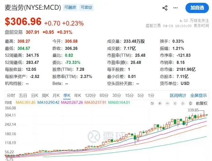 2、长期回购注销的预期会不会出现——消费股既然不差钱,其实可以长期回购股份进行注销的,美股的消费股长牛就是这样的,比如麦当劳长期回购注销股份,导致现在市净率是-121.83,每股净资产是-2.52美元,来欣赏一下麦当劳长年累月六亲不认的涨势(季K线图):